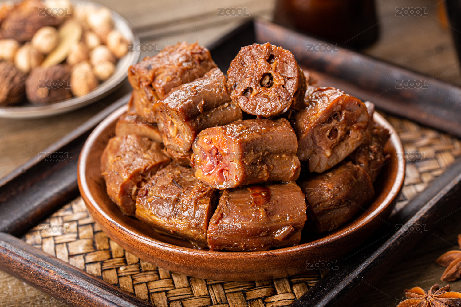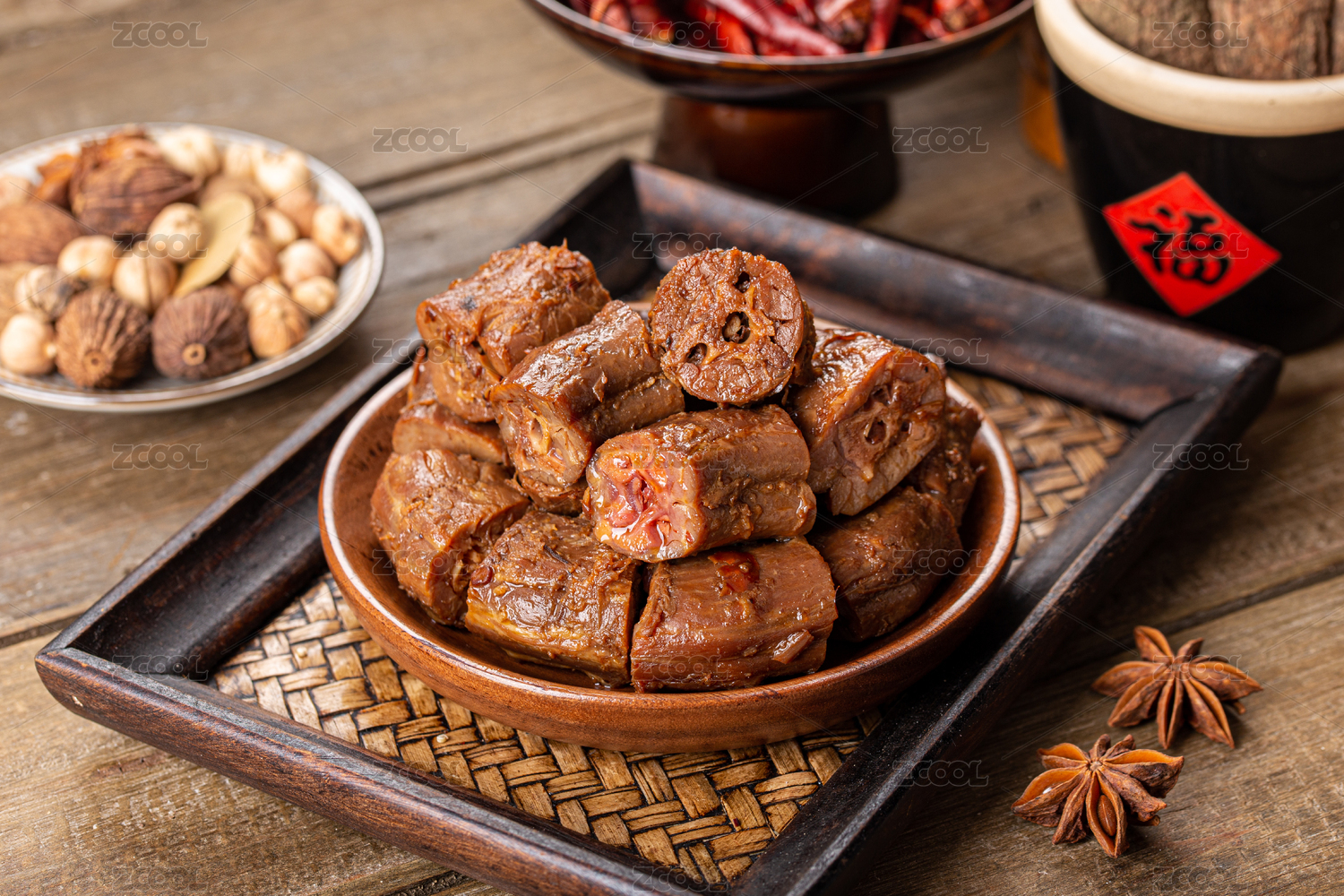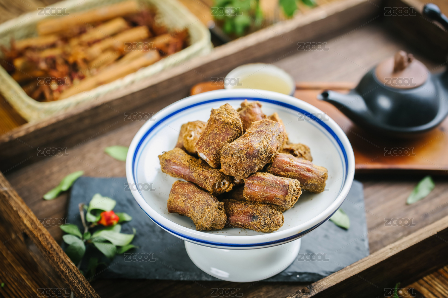 复古中国风背景里的盘子装的麻辣鸭脖