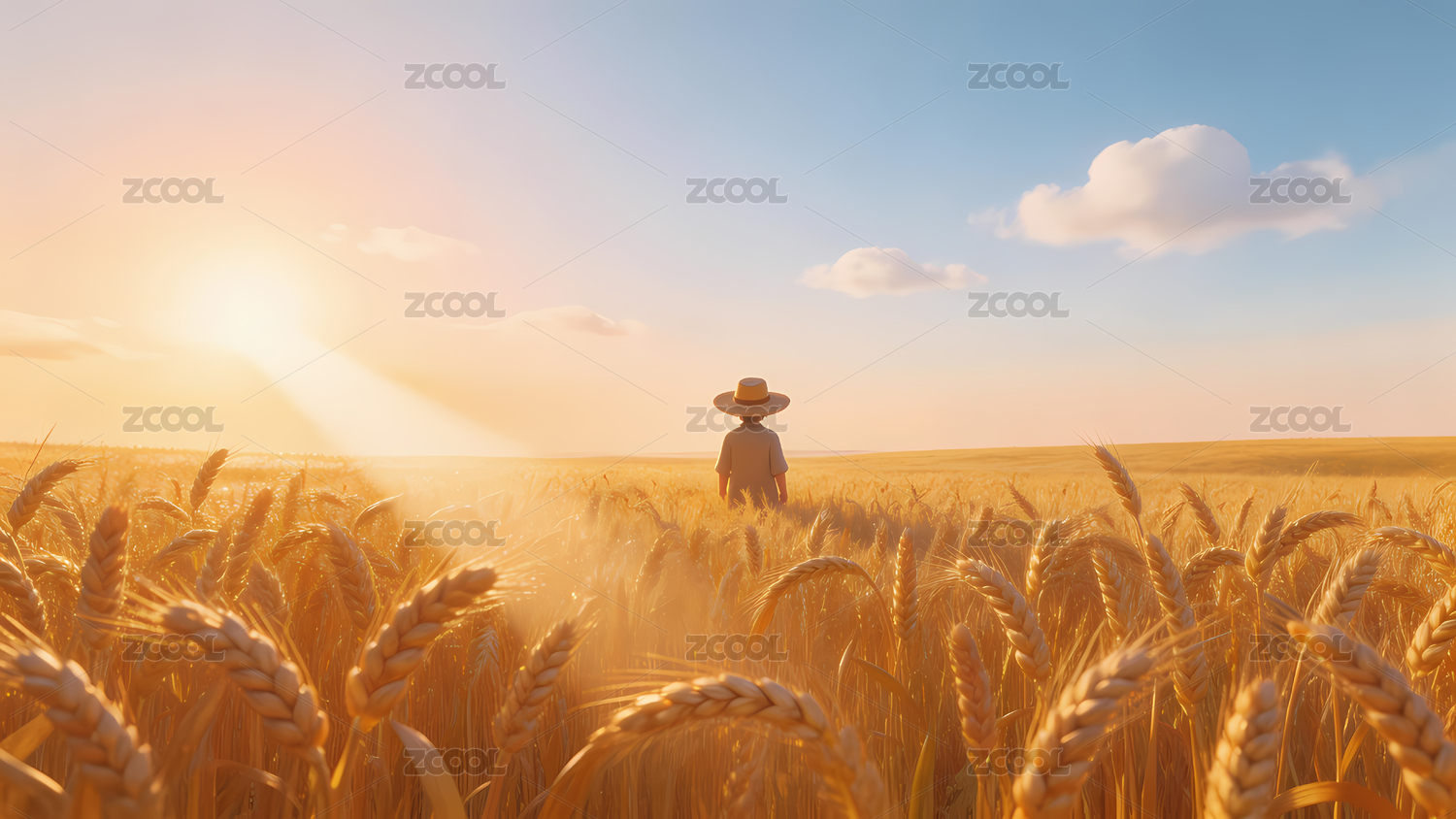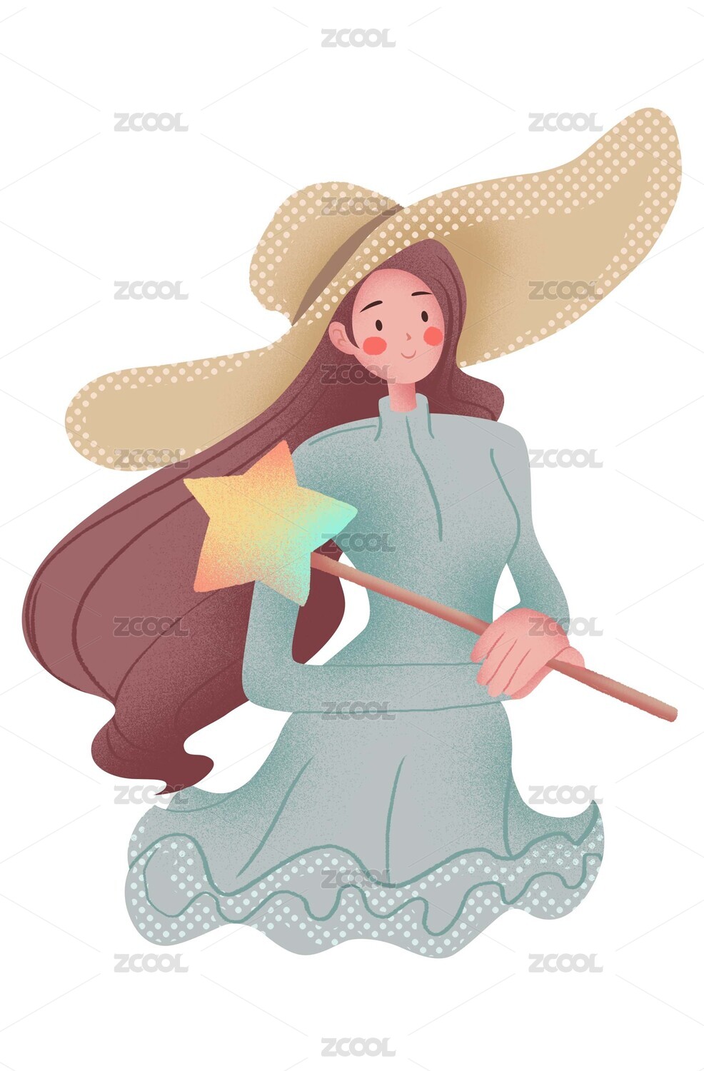 手拿魔法棒戴着宽边草帽披着棕褐色长发穿薄荷绿套群的温婉女神