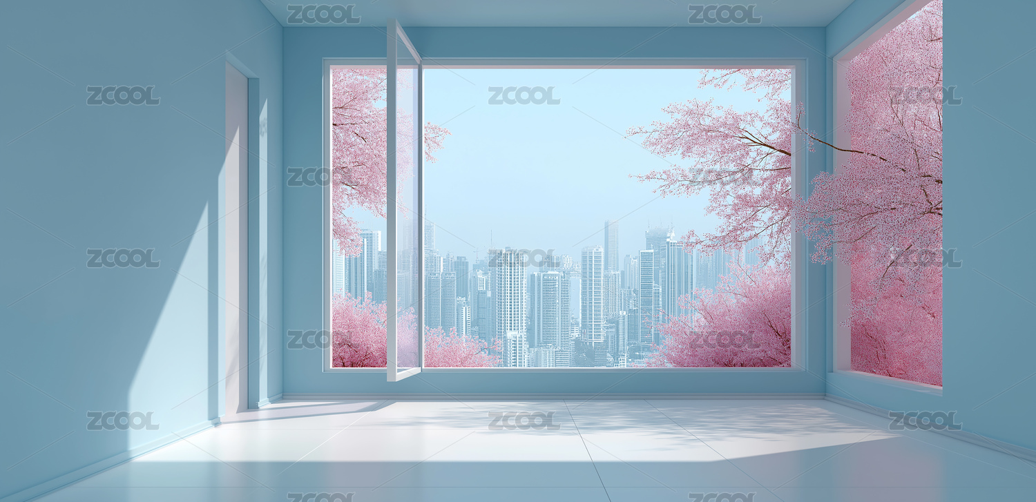 淡蓝室内开窗观都市粉樱艺术图案