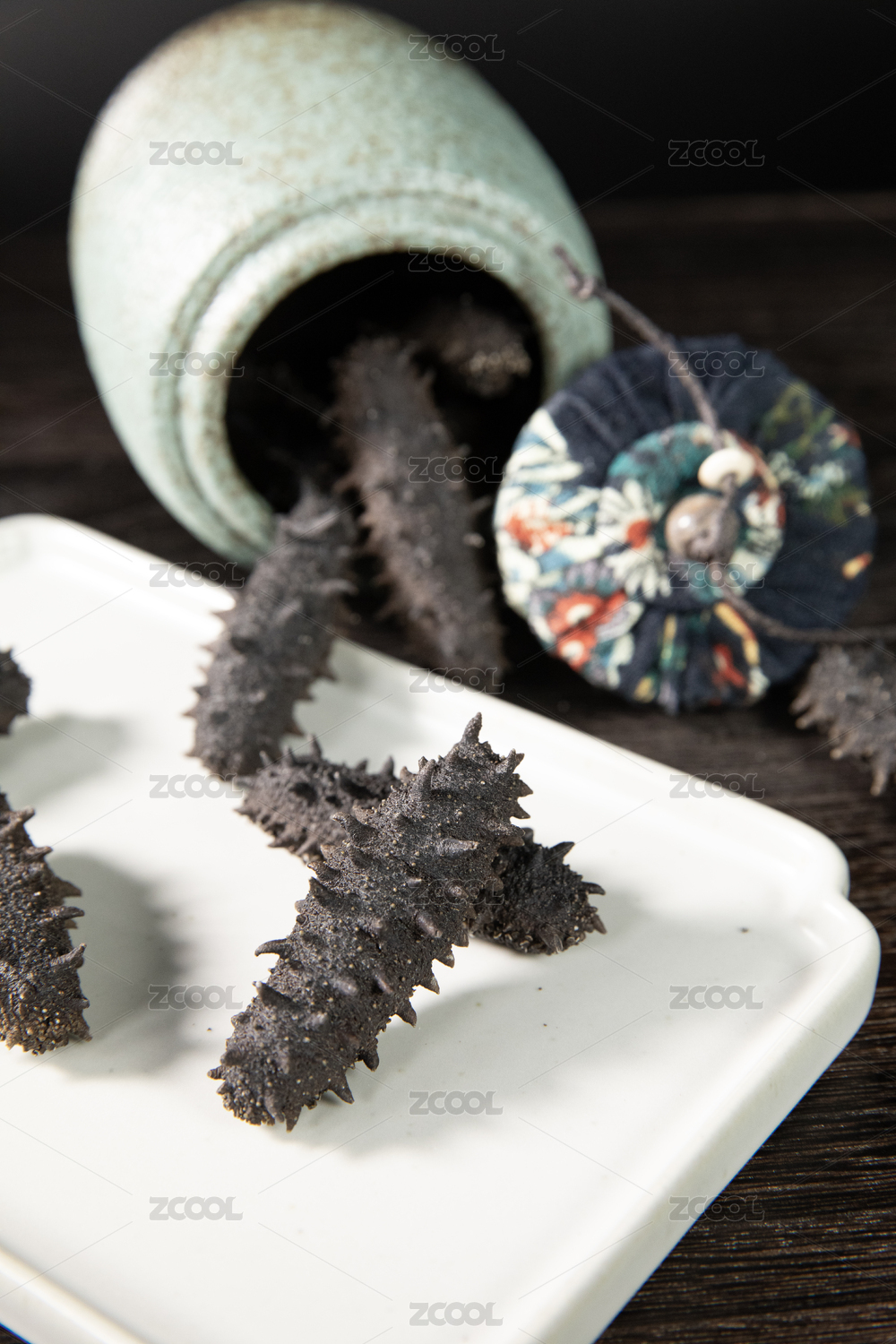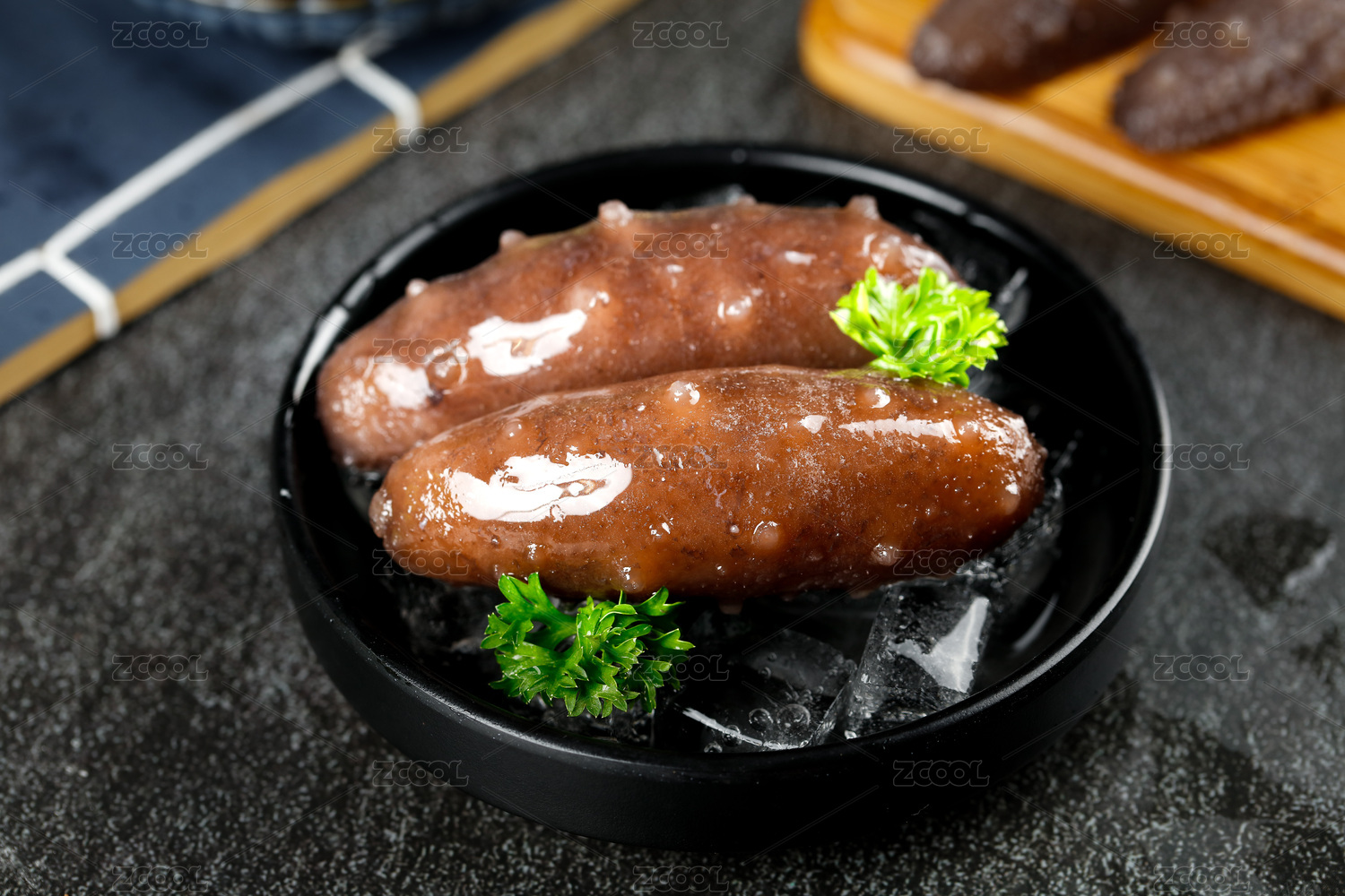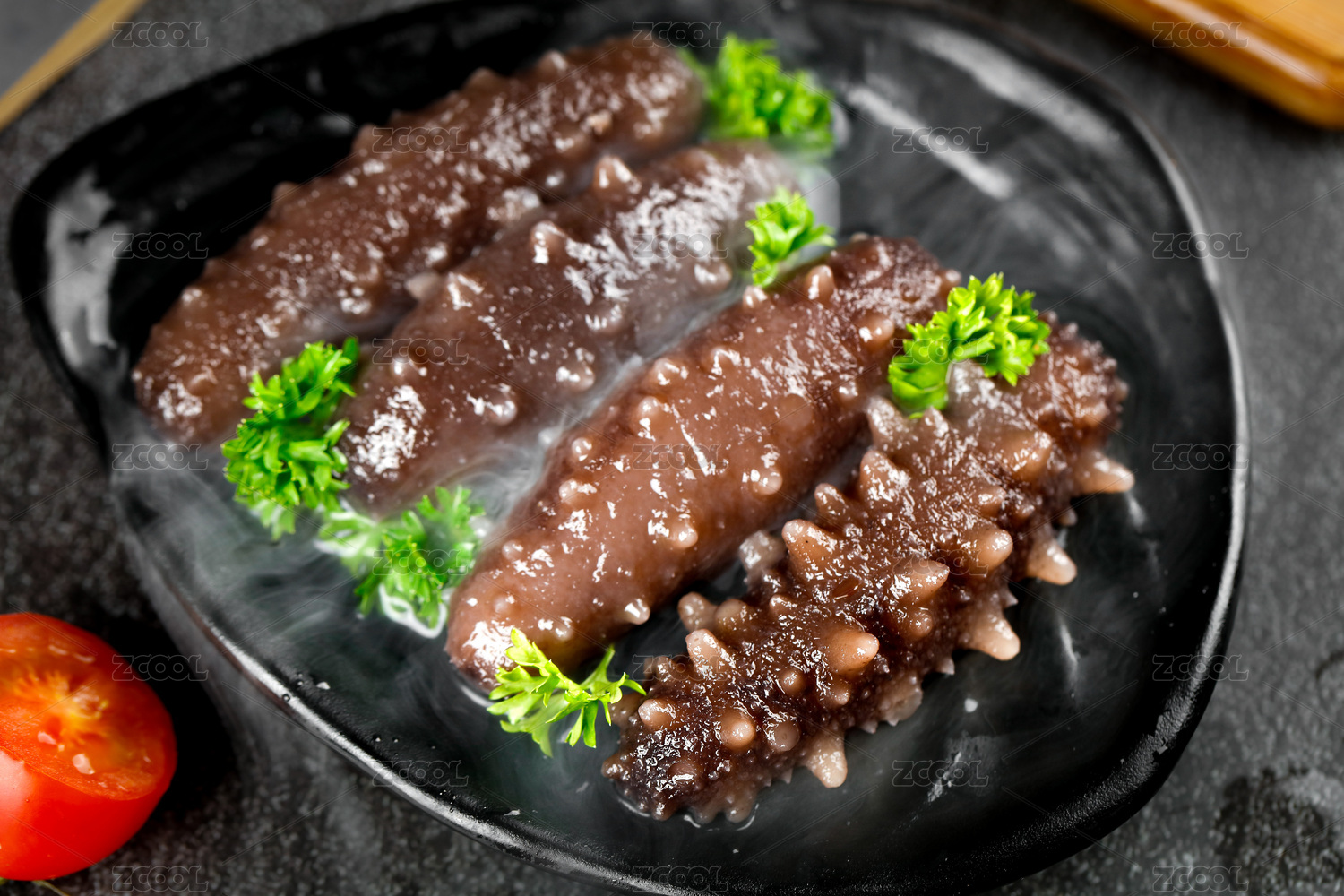 黑底上放着一盘即食海参