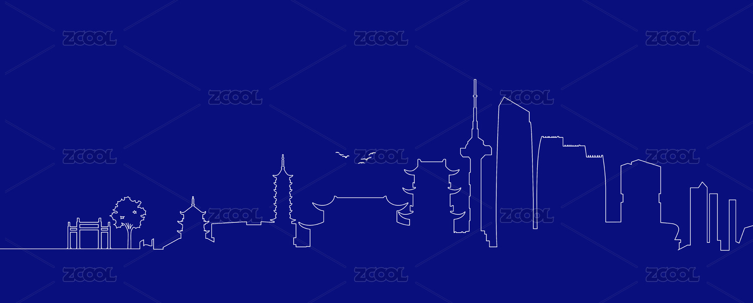 盐城城市地标建筑蓝色线描插画