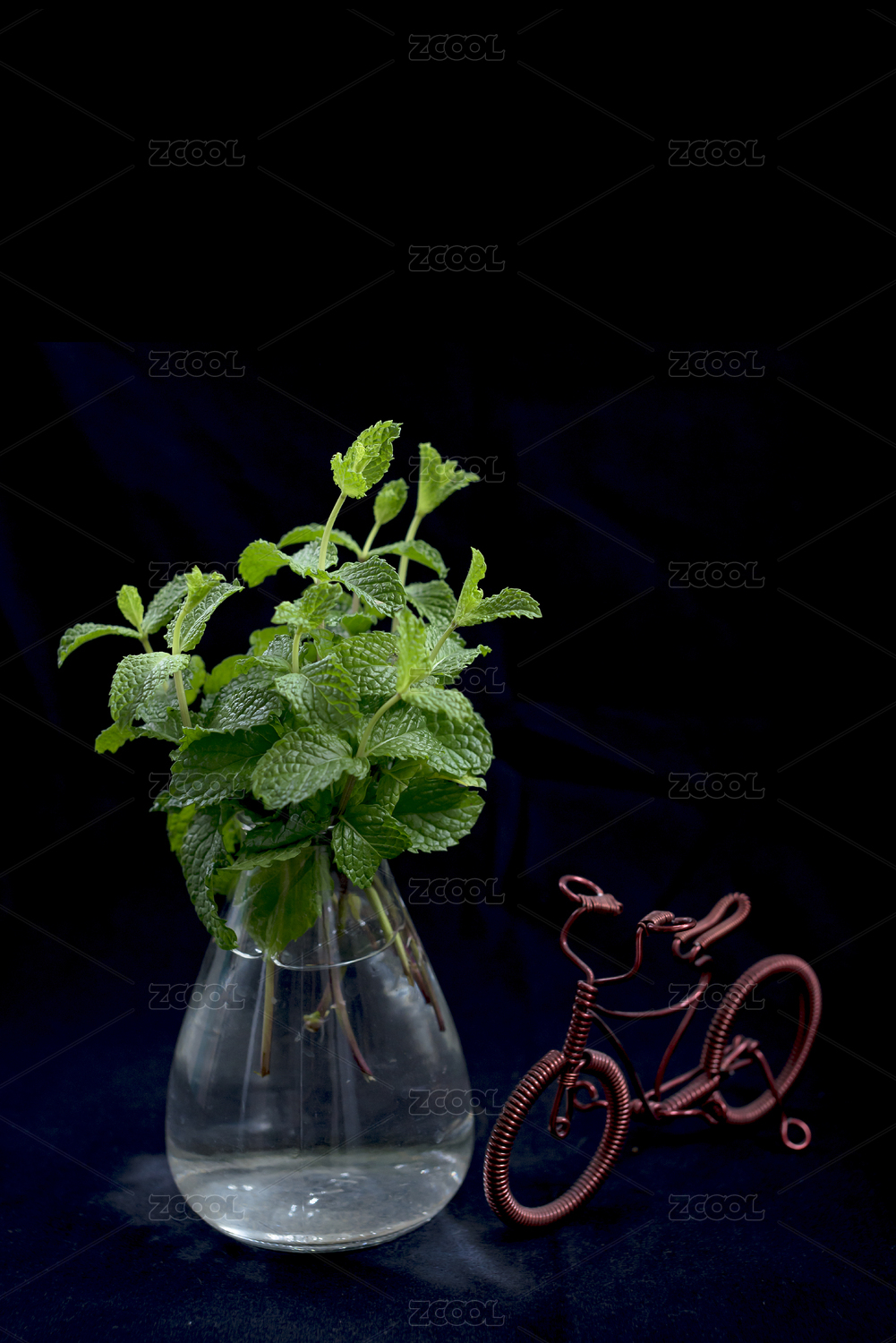 黑色背景下一瓶水培的薄荷植株和一铜线制作的单车