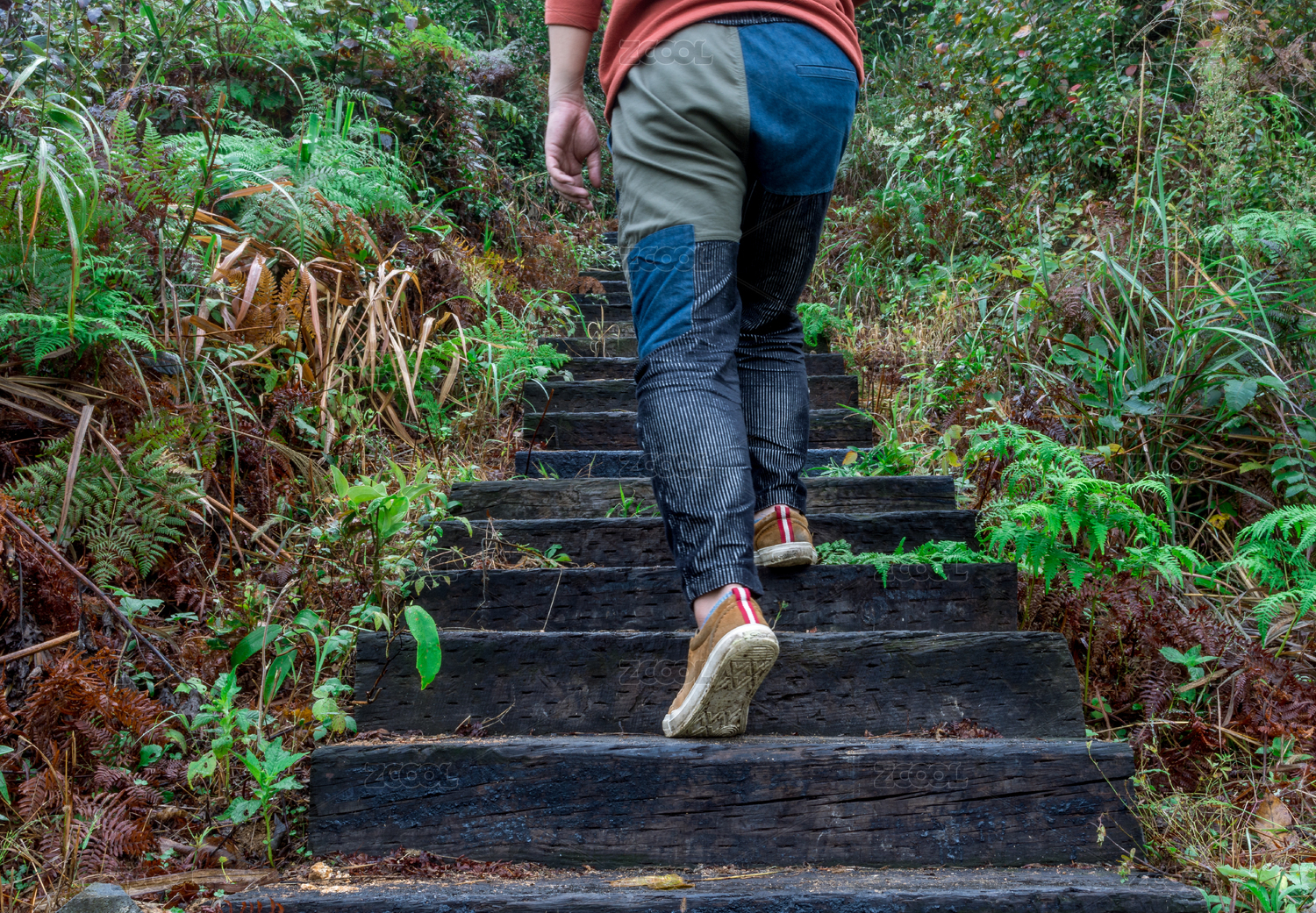 山林中穿着补丁裤子向上攀爬台阶的人