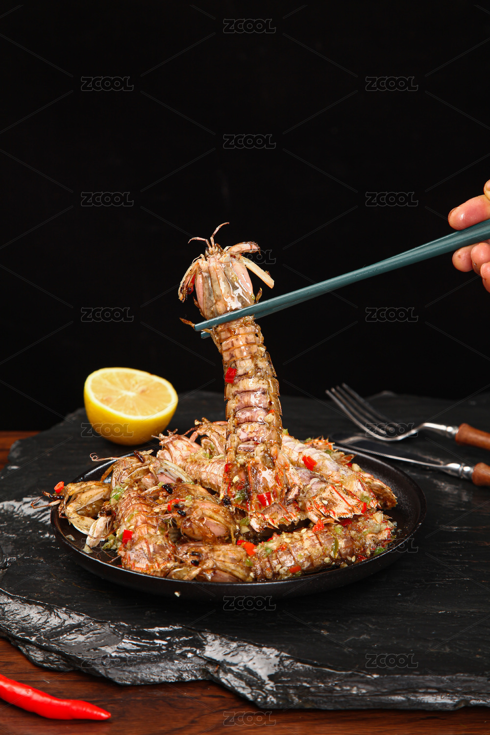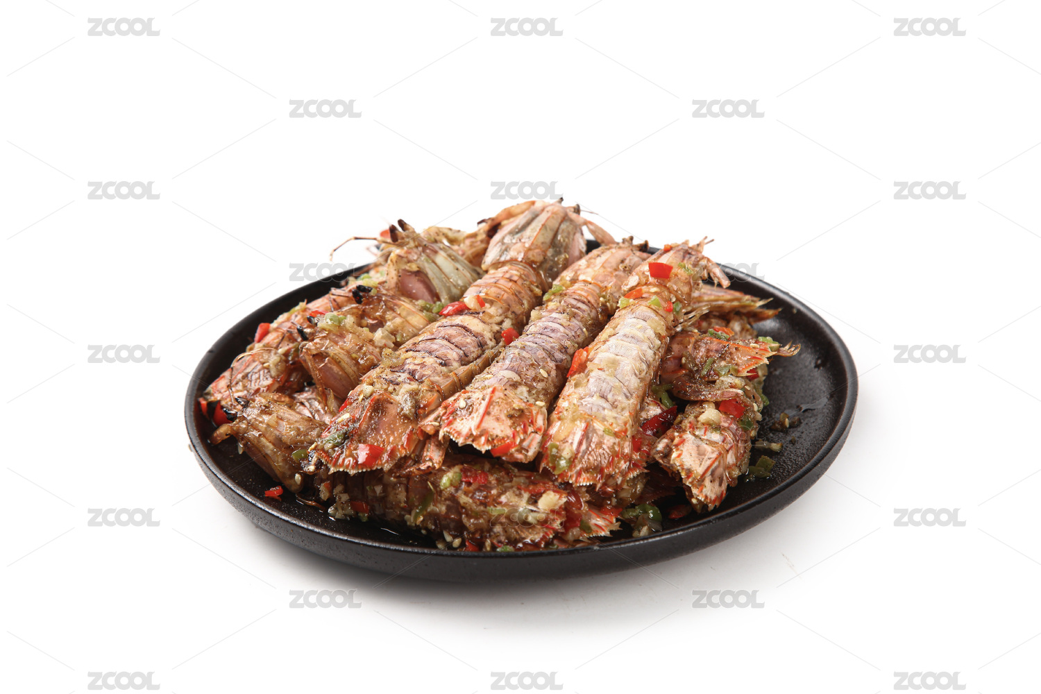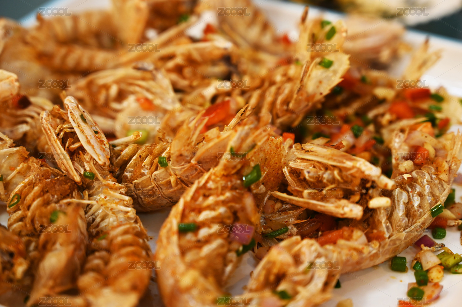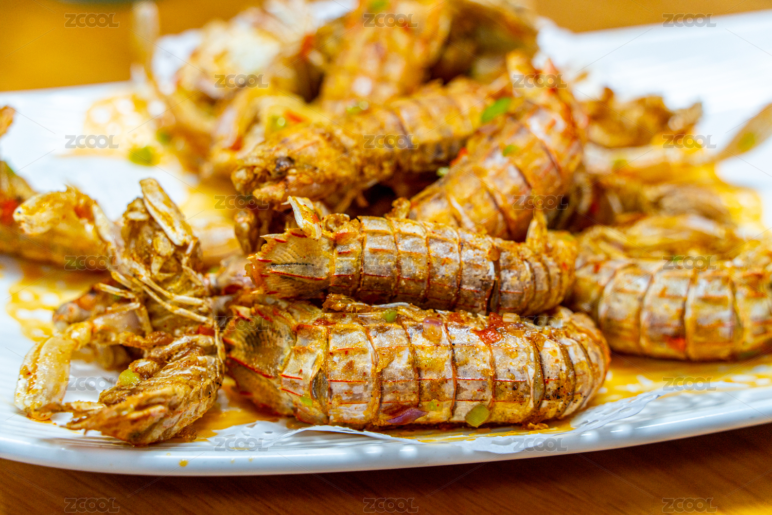 海南三亚特色海鲜椒盐皮皮虾静物特写