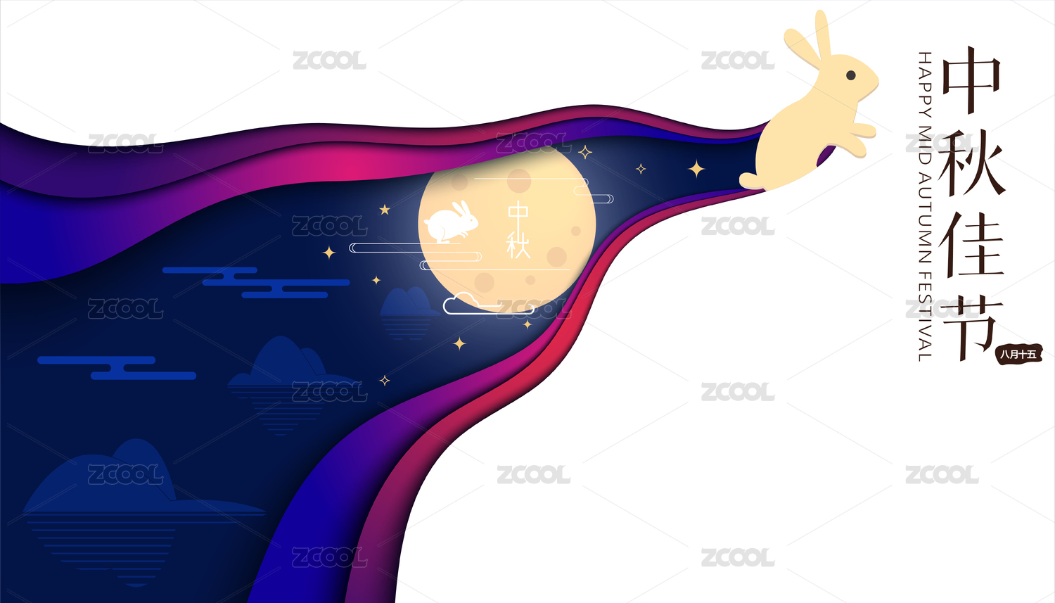 剪纸风格的中秋节矢量海报或贺卡模板,满月和玉兔,祥云图案