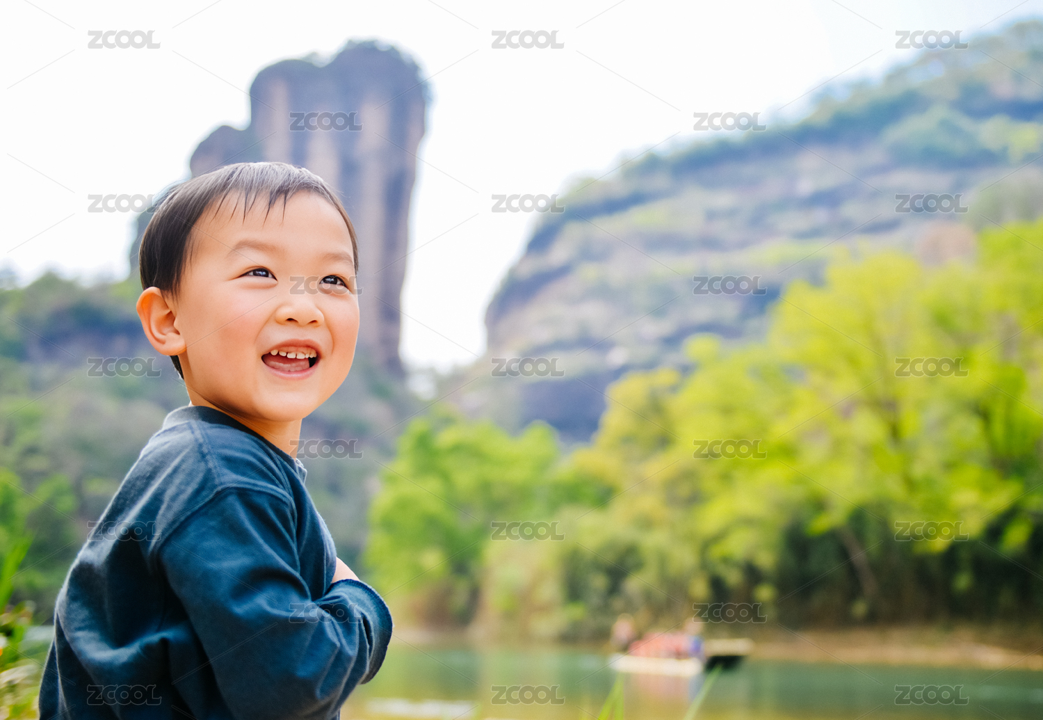 5岁亚洲儿童在武夷山九曲溪河畔开心微笑