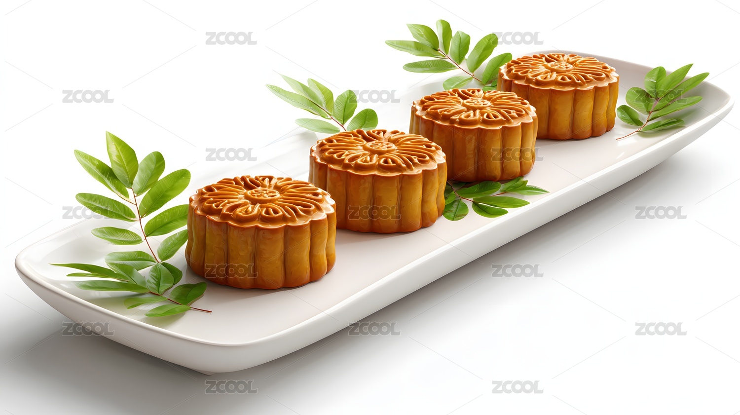长方形盘上整齐排列四个中式月饼绿叶装饰