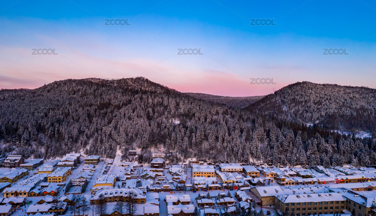 清晨航拍中国东北雪乡雪谷小镇日出朝霞雪景