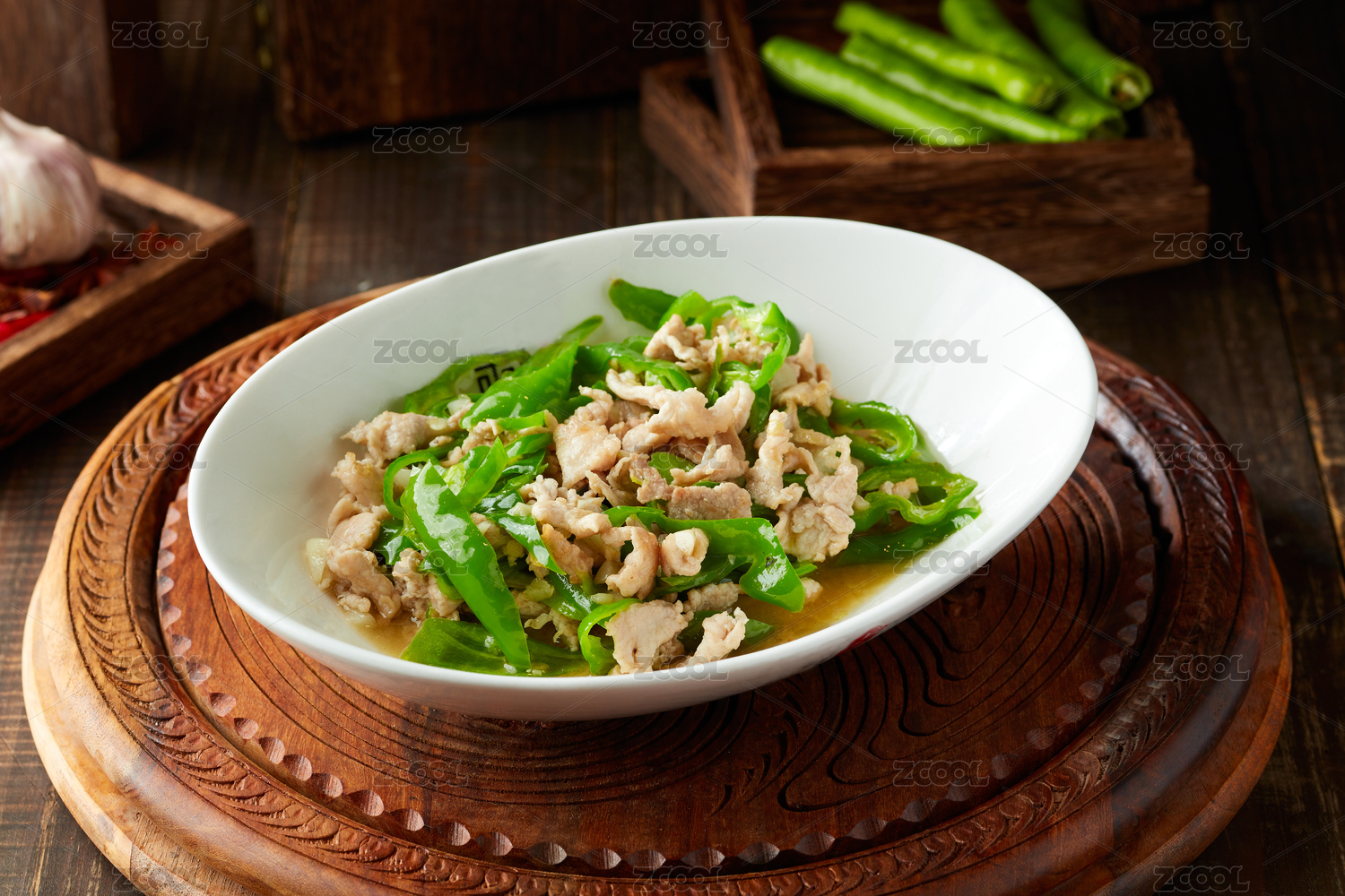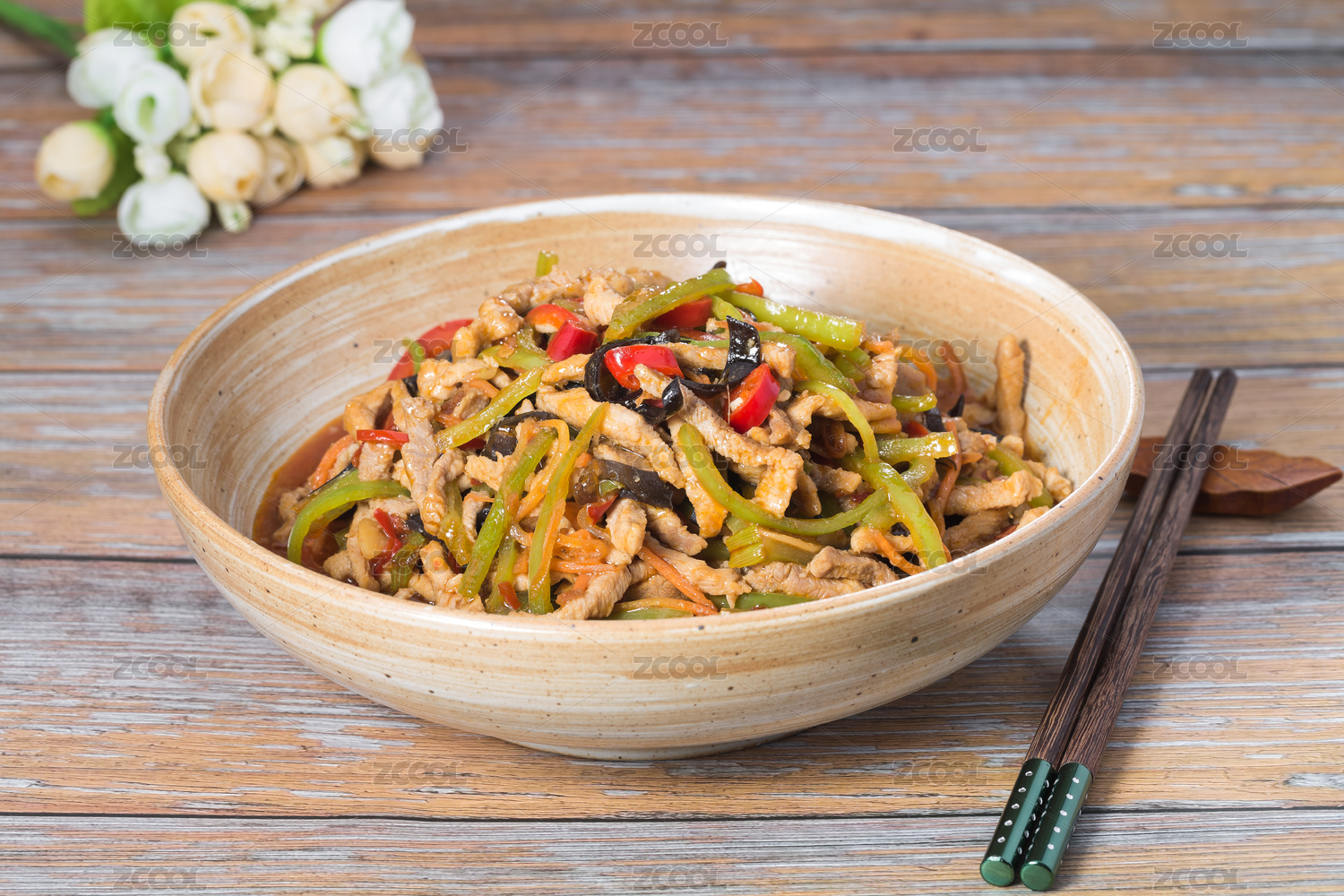 木纹背景上碗里的鱼香肉丝