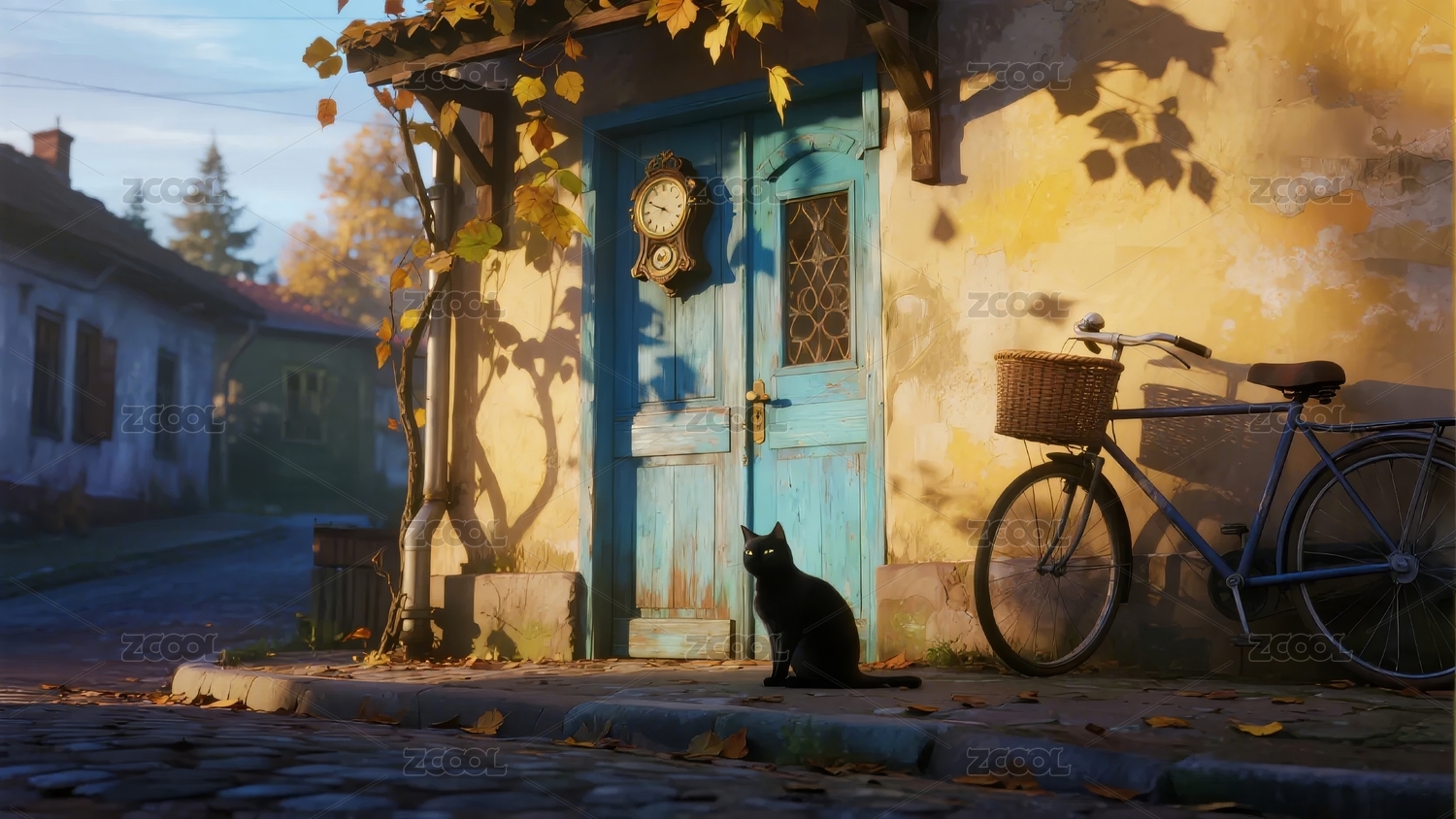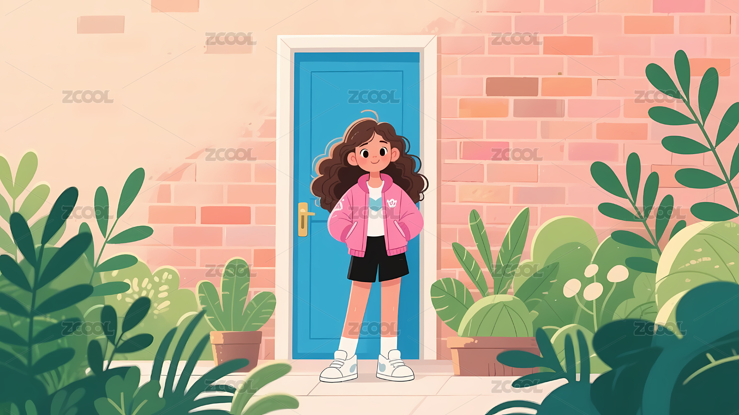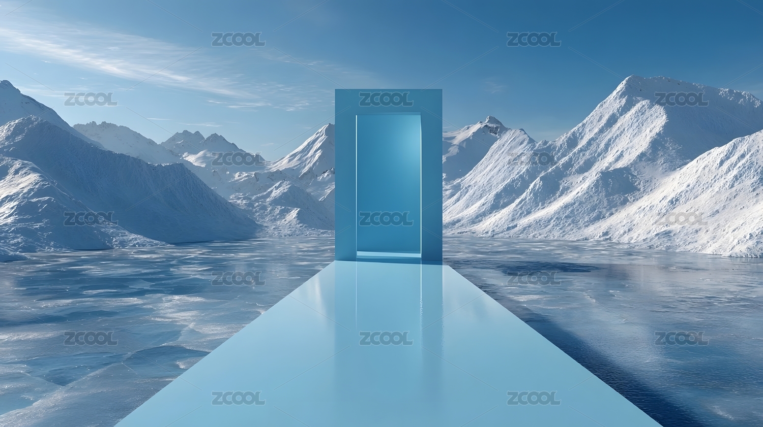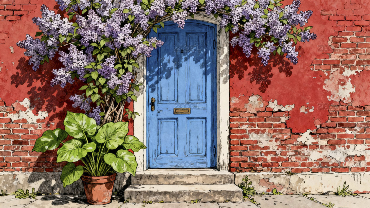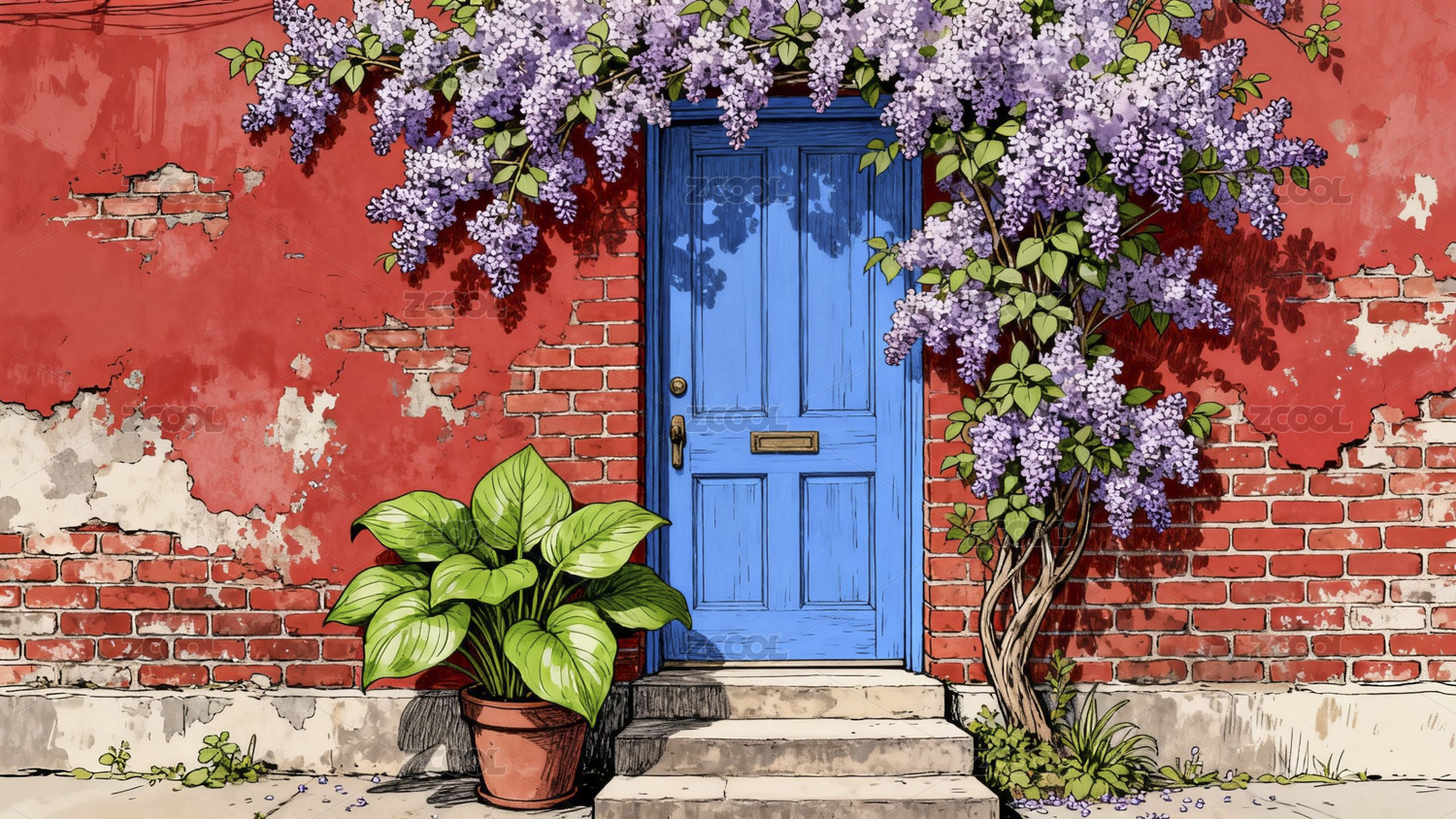 树立在空旷草地上的一块装饰有花的淡蓝门板