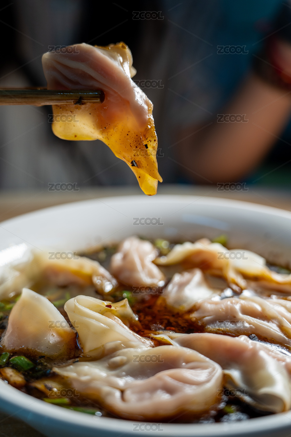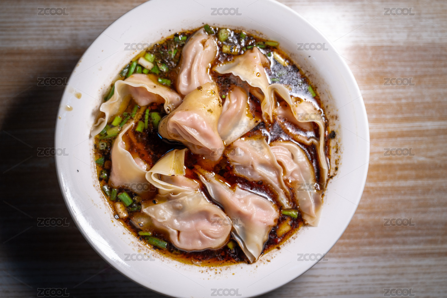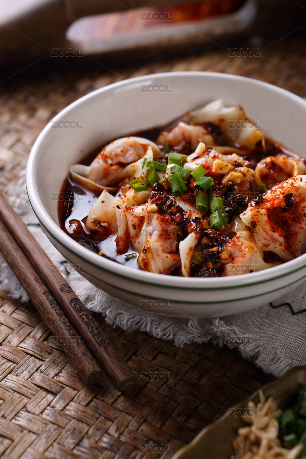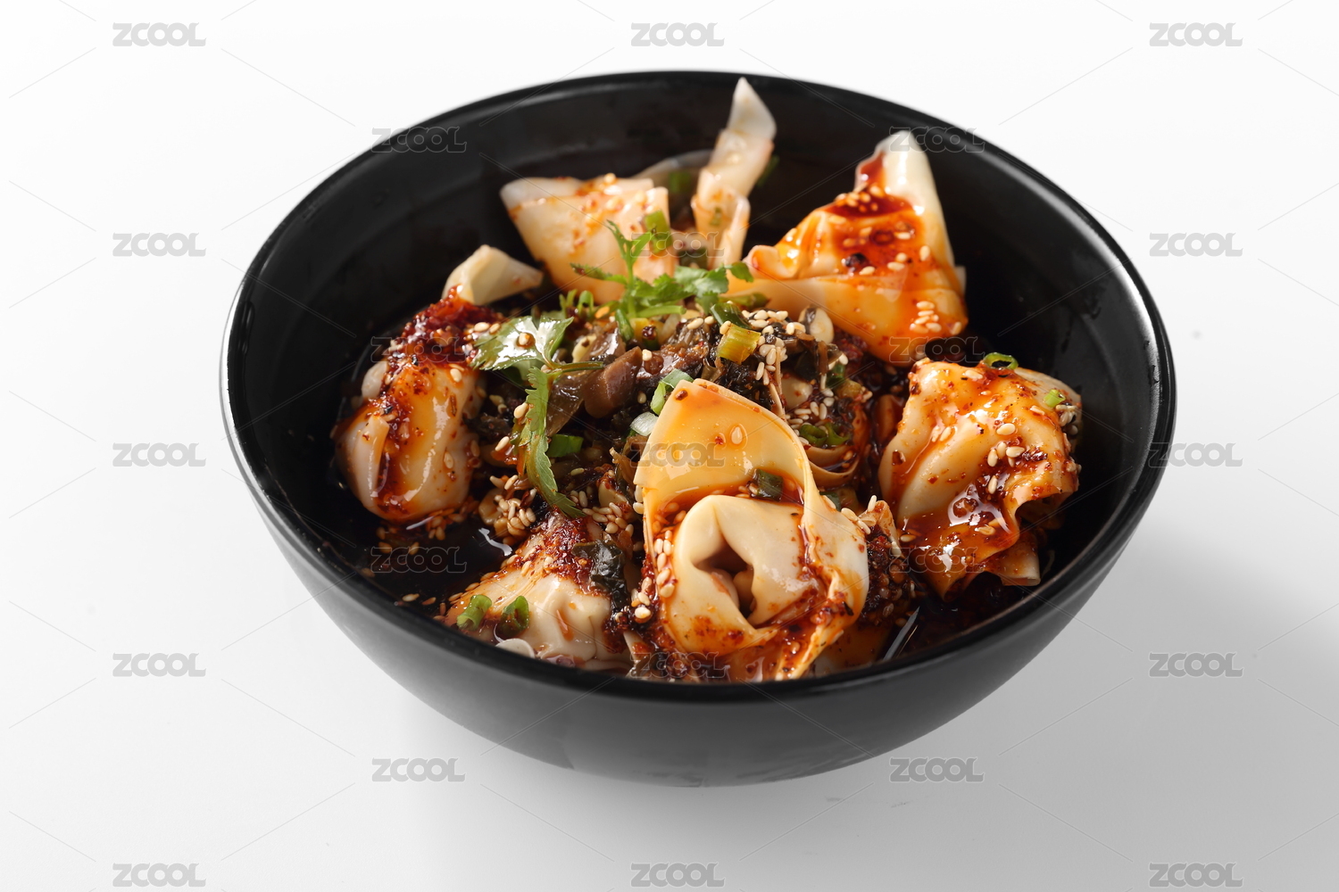 放在大黑碗里辣椒油淋麻辣味抄手小吃
