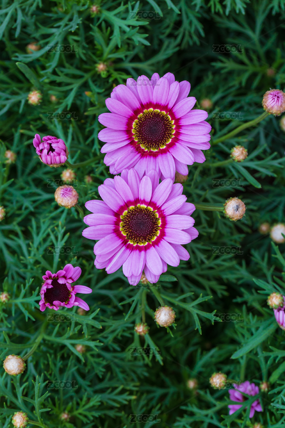 盛开的紫色菊科花朵和绿色叶子蒿子秆