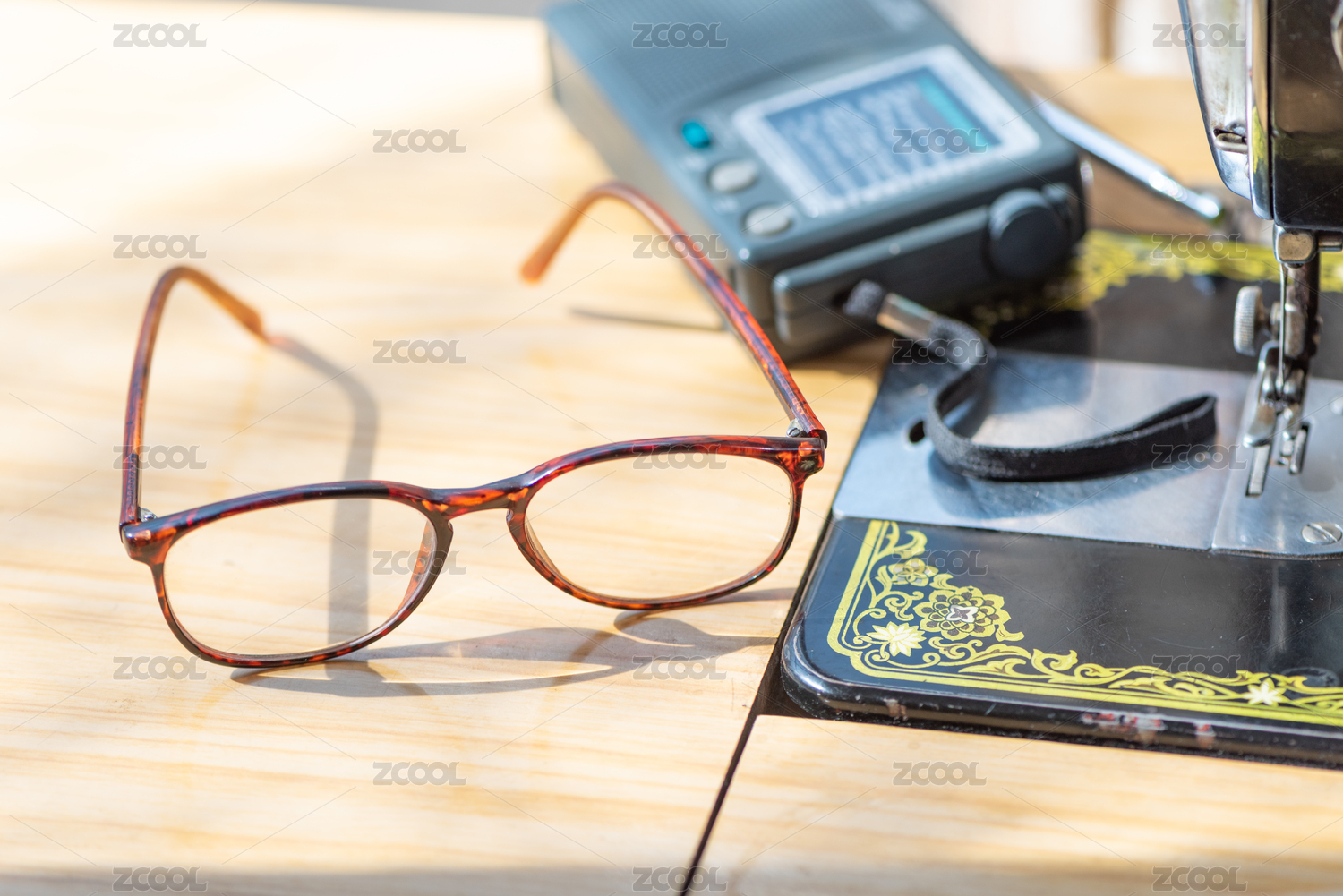 坐在中式庭院中学习使用老式缝纫机的女孩