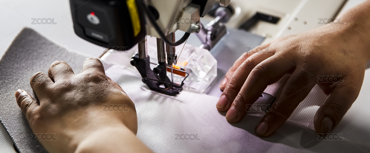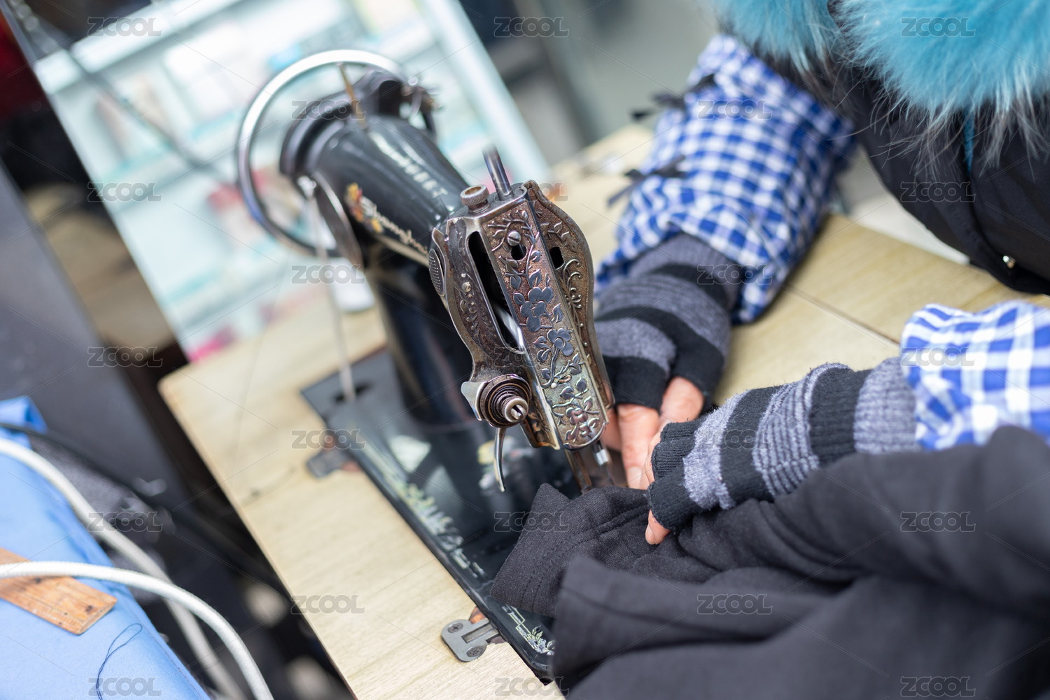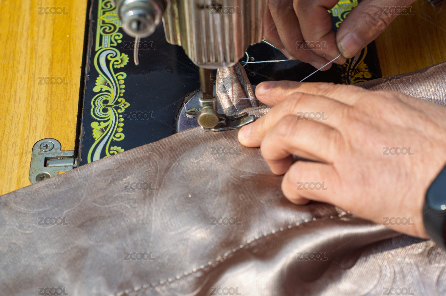 传统老式缝纫机缝制蓝布花纹蓝印花布手工艺
