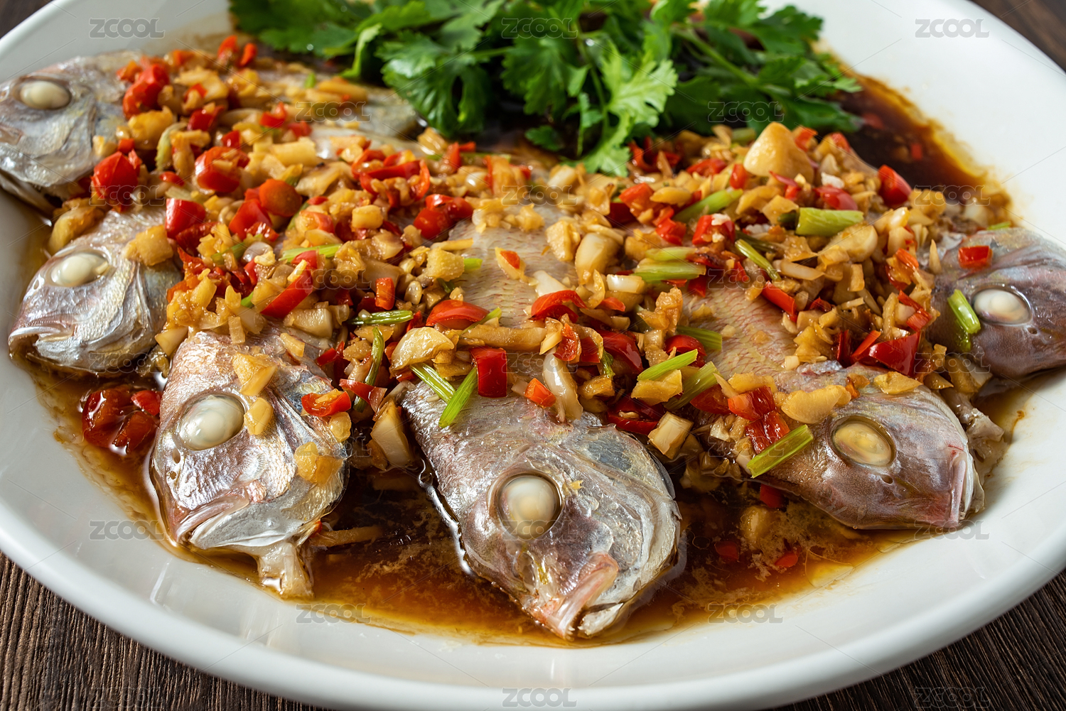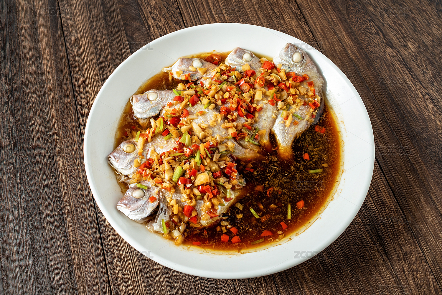 中国菜辣椒蒸红鲷鱼在木板背景上