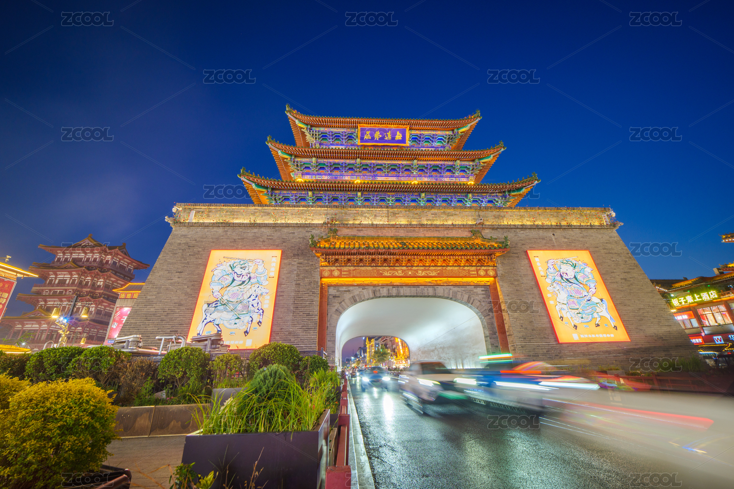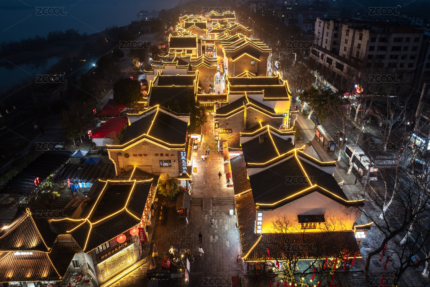 中国山东省青州市夜晚古城商业街园林建筑