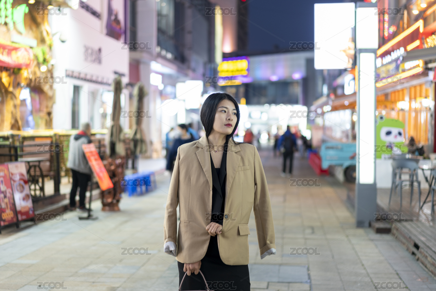 一个年轻女性经过夜晚商业街