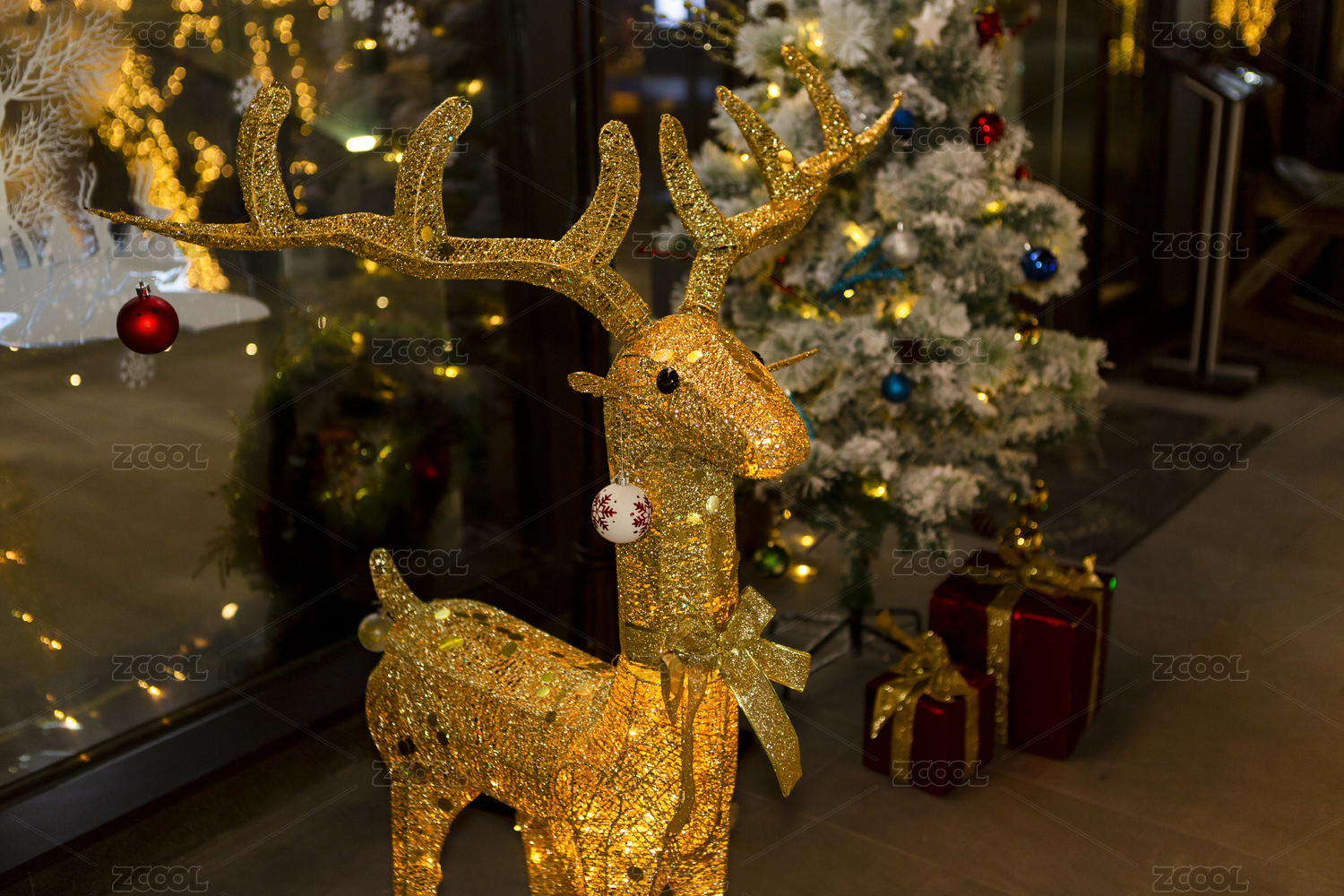 夜晚商业街里圣诞树旁的金色的闪闪发光的麋鹿