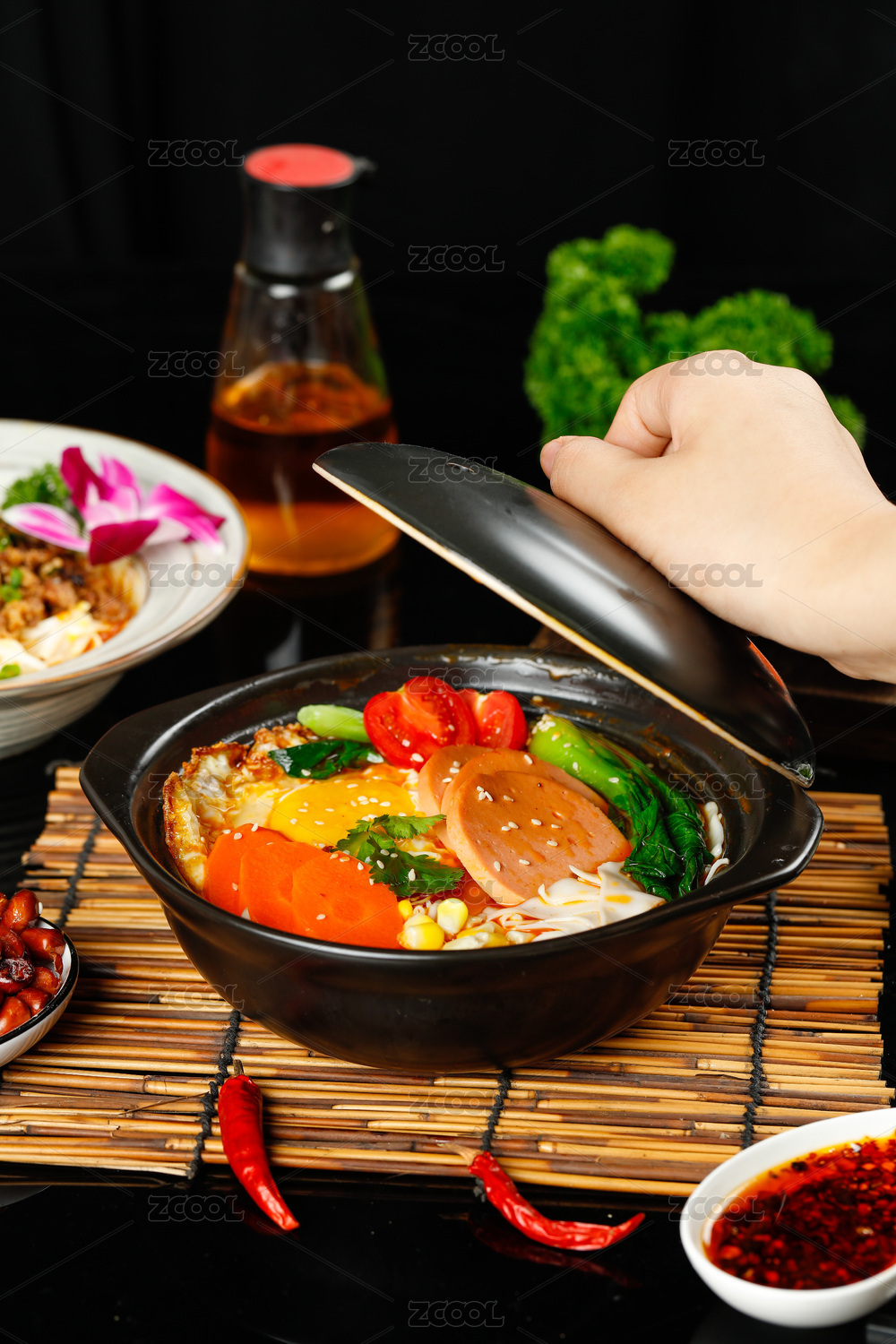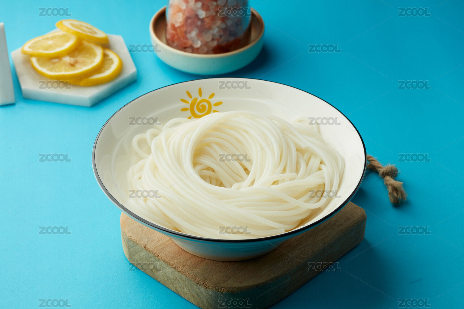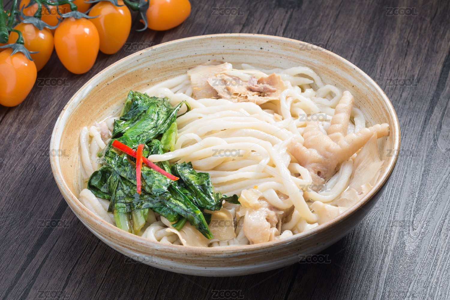 竹底上放着一碗三鲜面和筷子上夹着面片