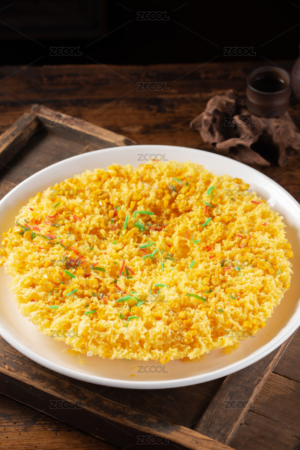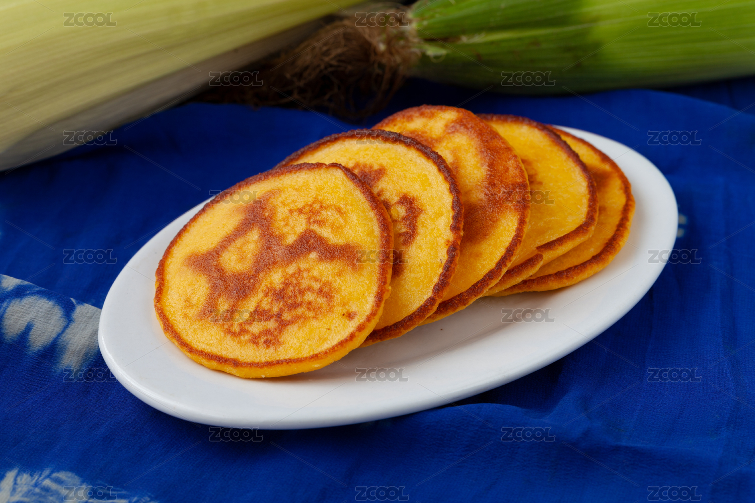一盘香酥玉米烙和叉子上叉碰上玉米烙