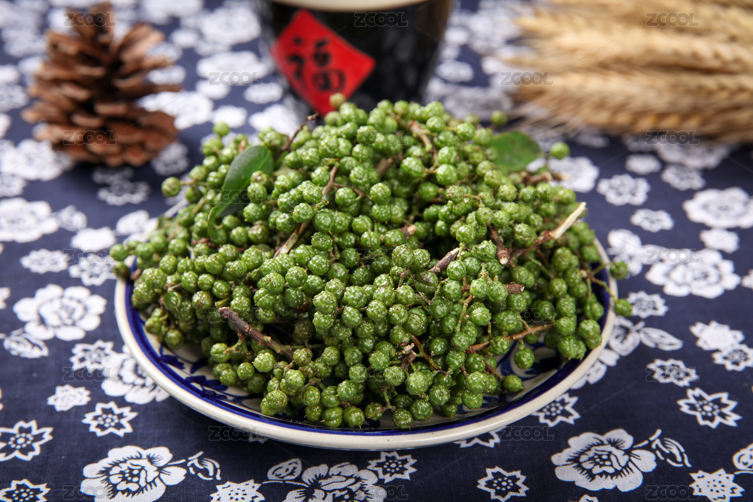 木底上放着一堆山花椒和麻袋里装着藤椒