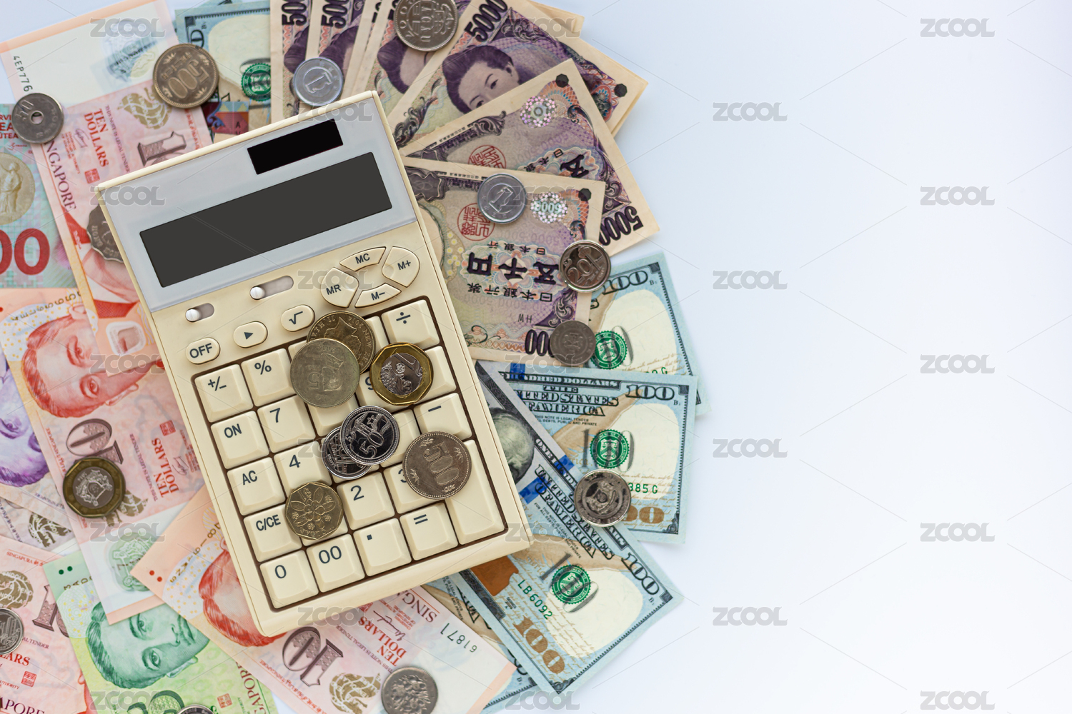 计算器和一些钱币放在一起