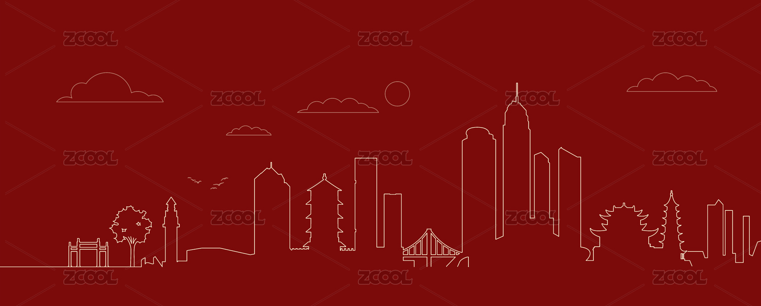 山东烟台城市地标建筑红色线描插画