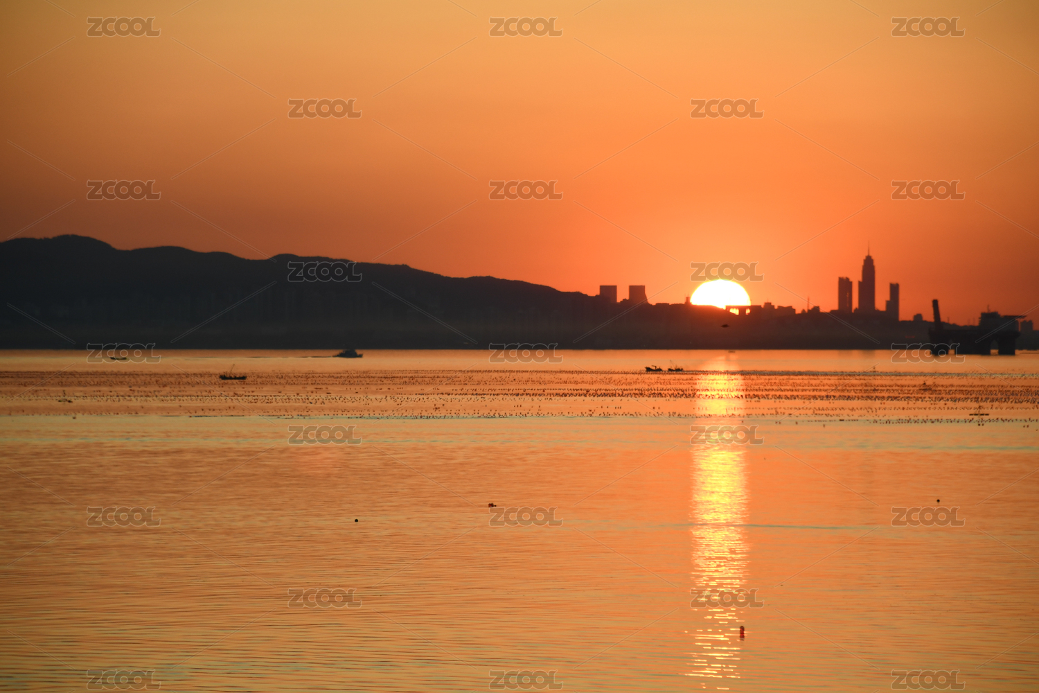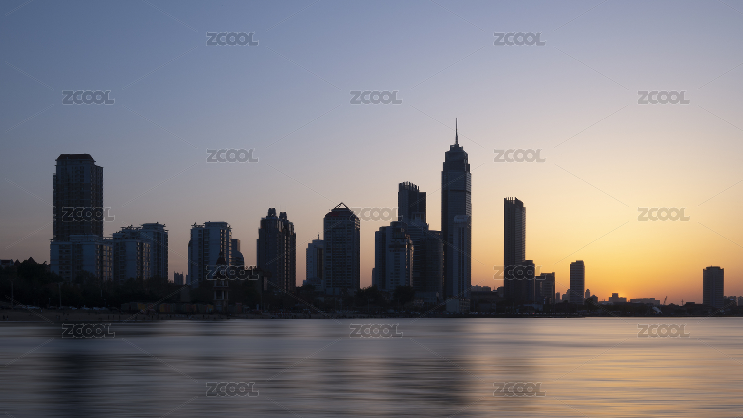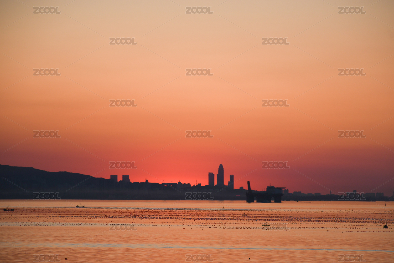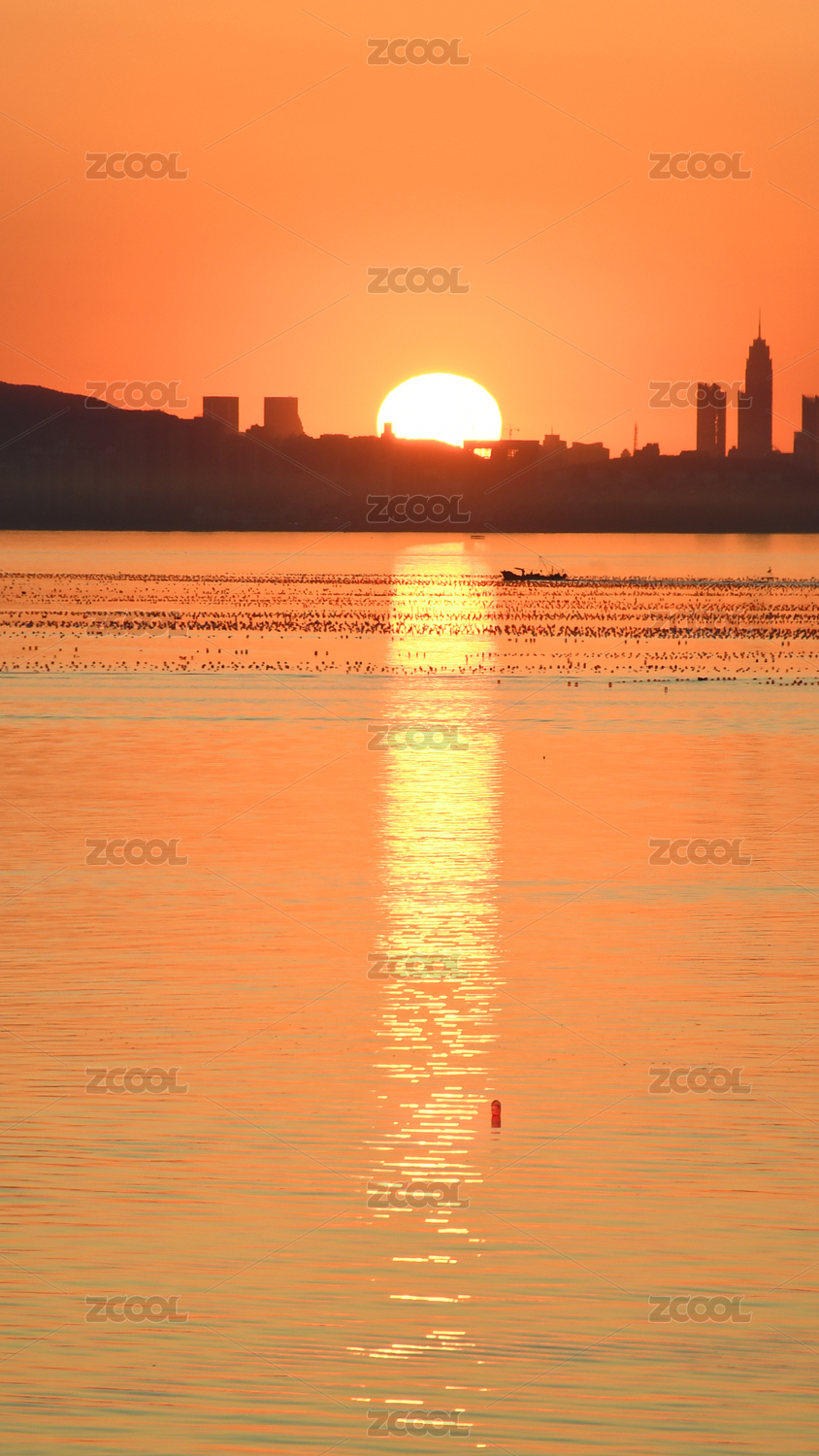 山东烟台海岸线日落剪影建筑风光