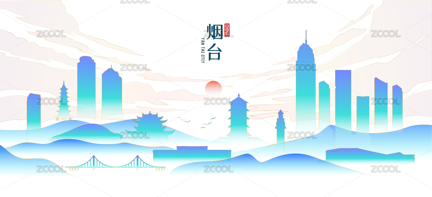 烟台城市地标建筑国潮风矢量手绘