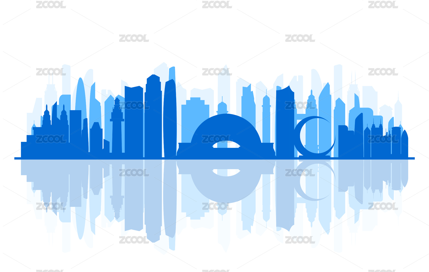 烟台城市地标建筑蓝色剪影矢量插画