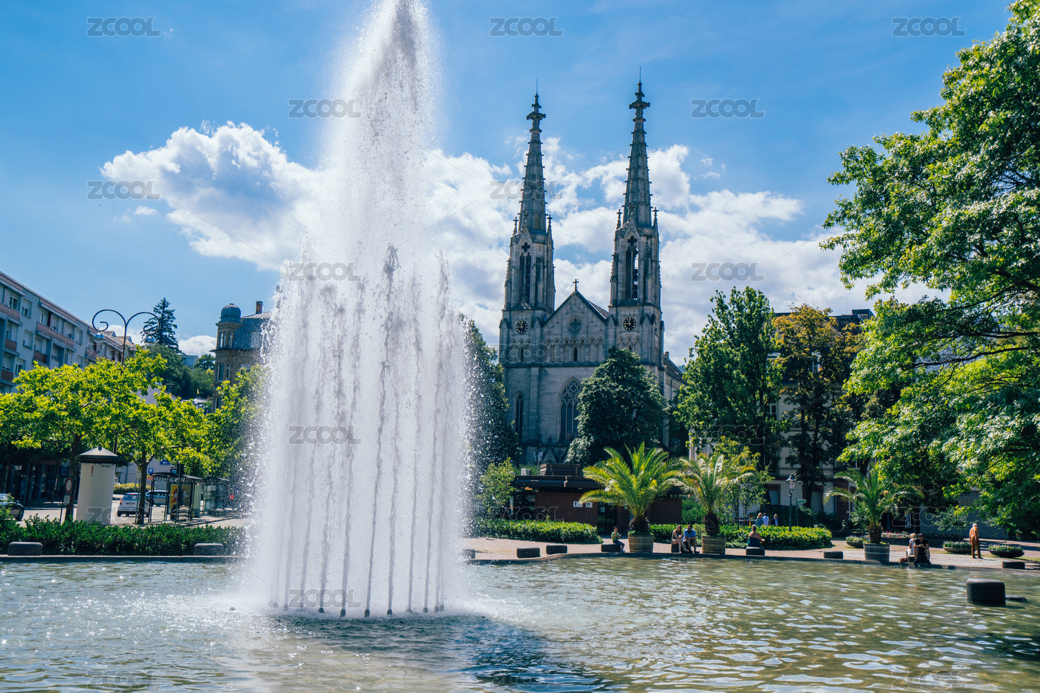 德国巴登巴登,哥特教堂前的美丽喷泉和花园
