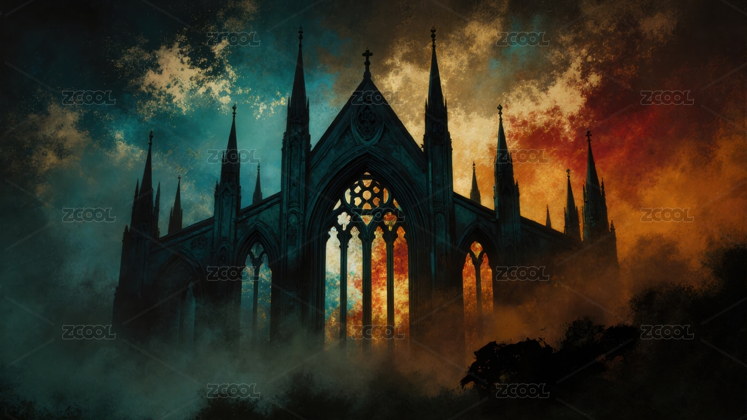 哥特教堂暮色剪影