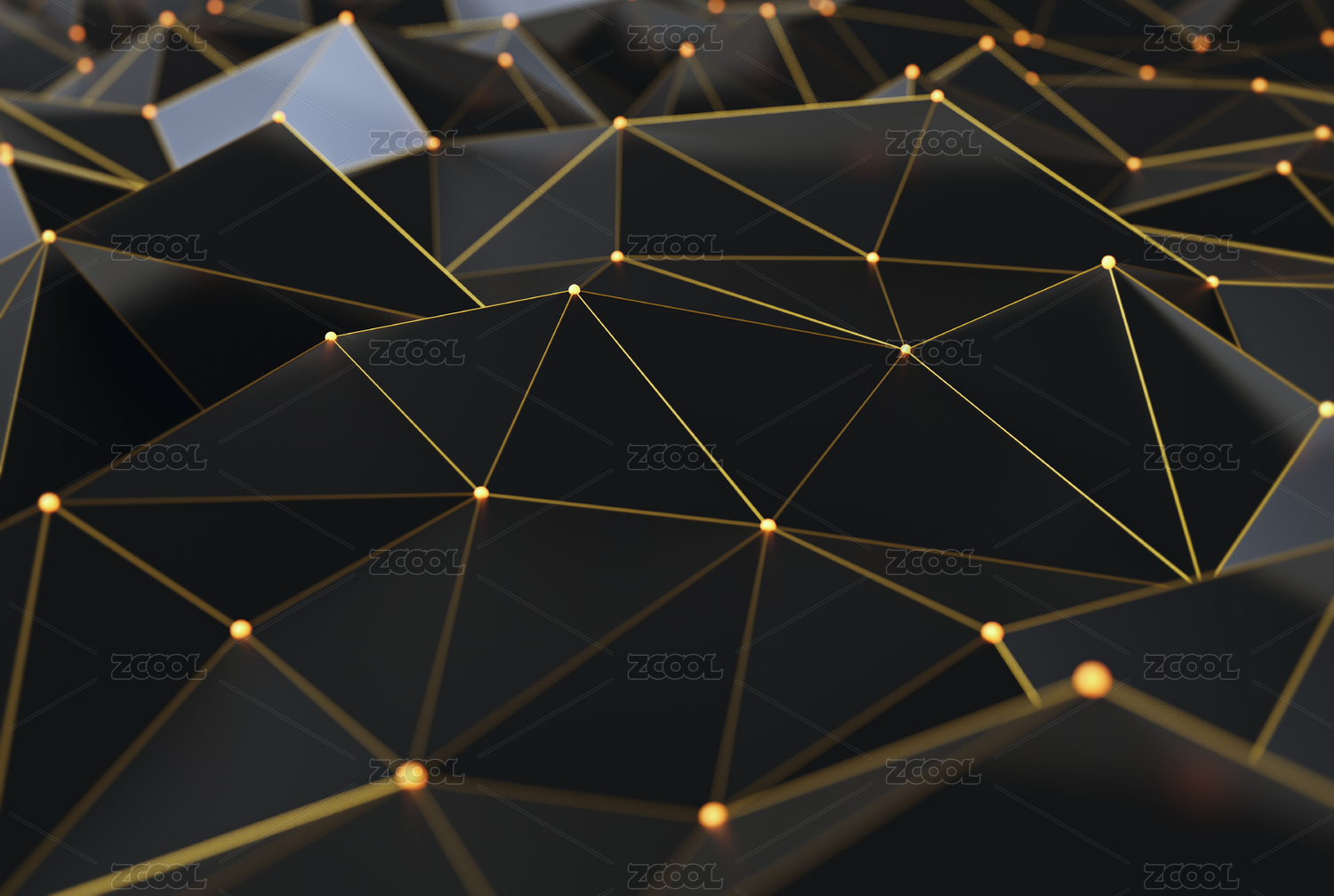 抽象的金色点线科技低面背景,点线相连,类似区块链和神经网络的概念。
