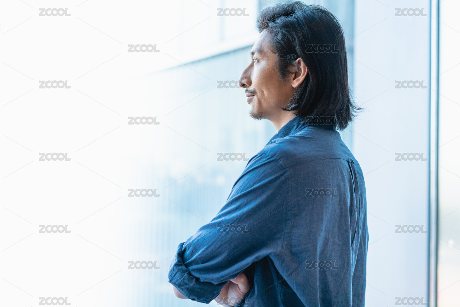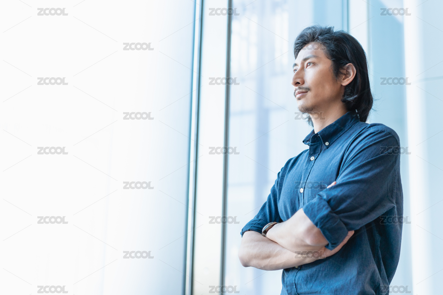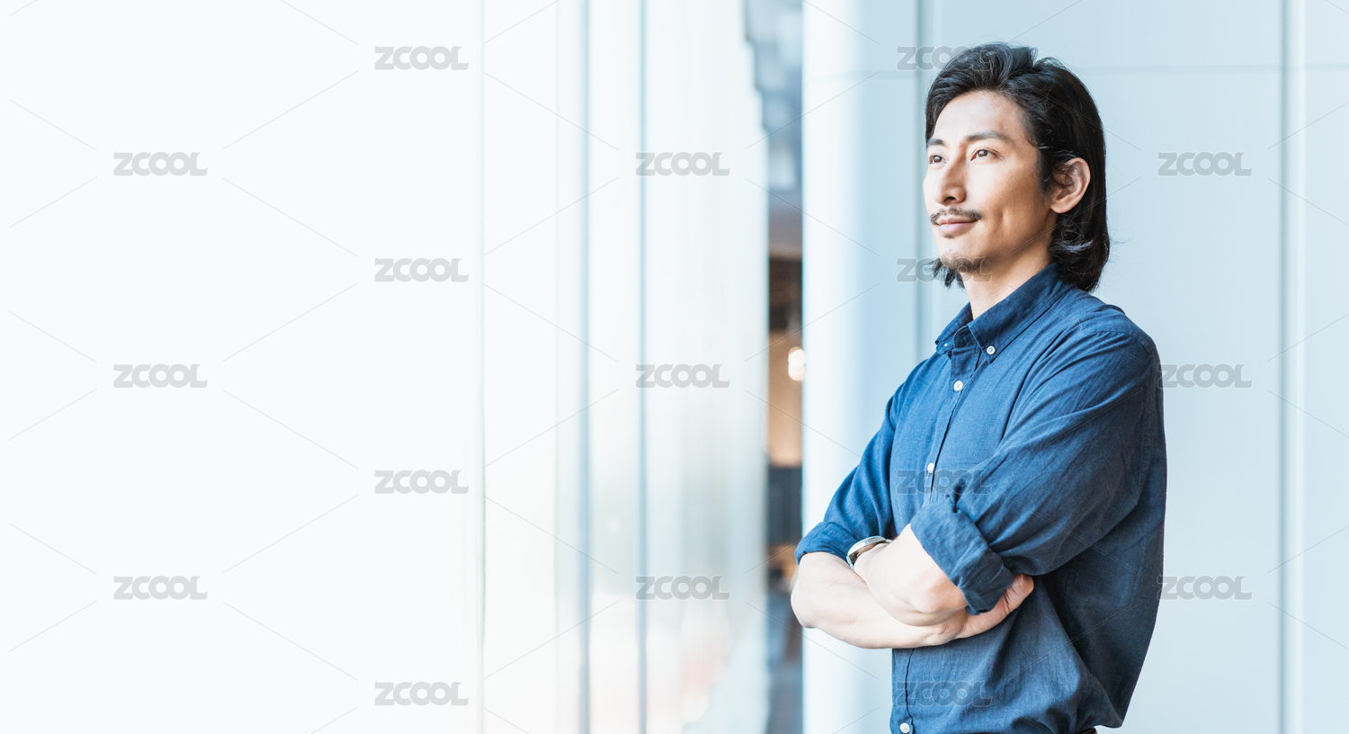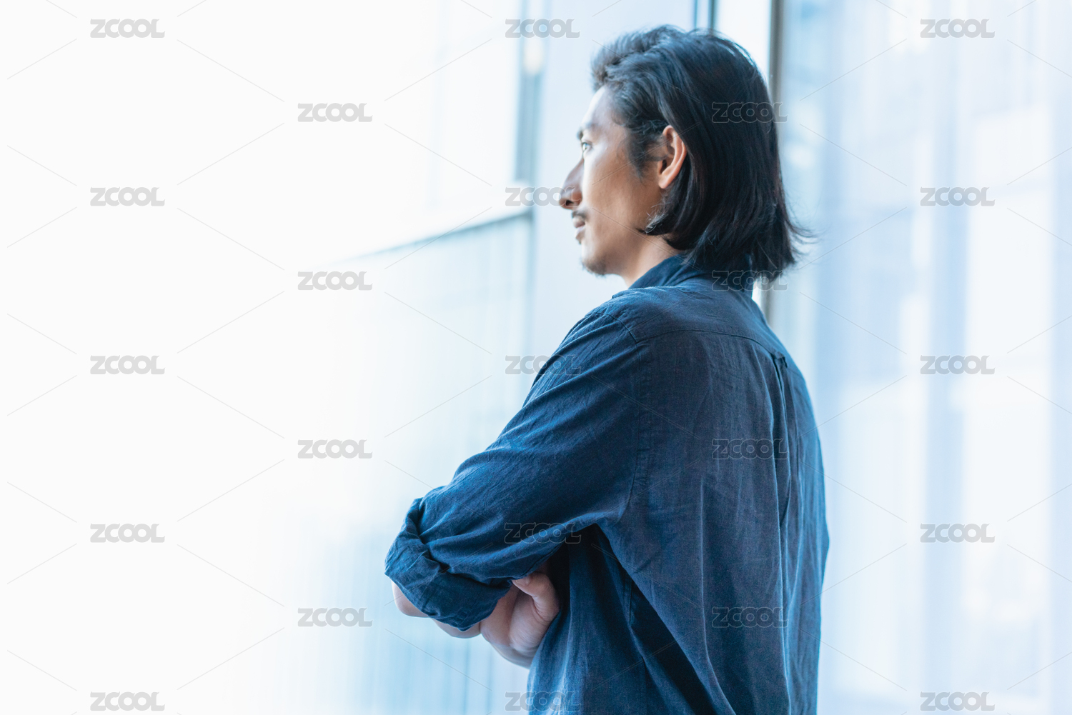 成熟自信的亚洲商务人士双手环抱站在窗边看远方
