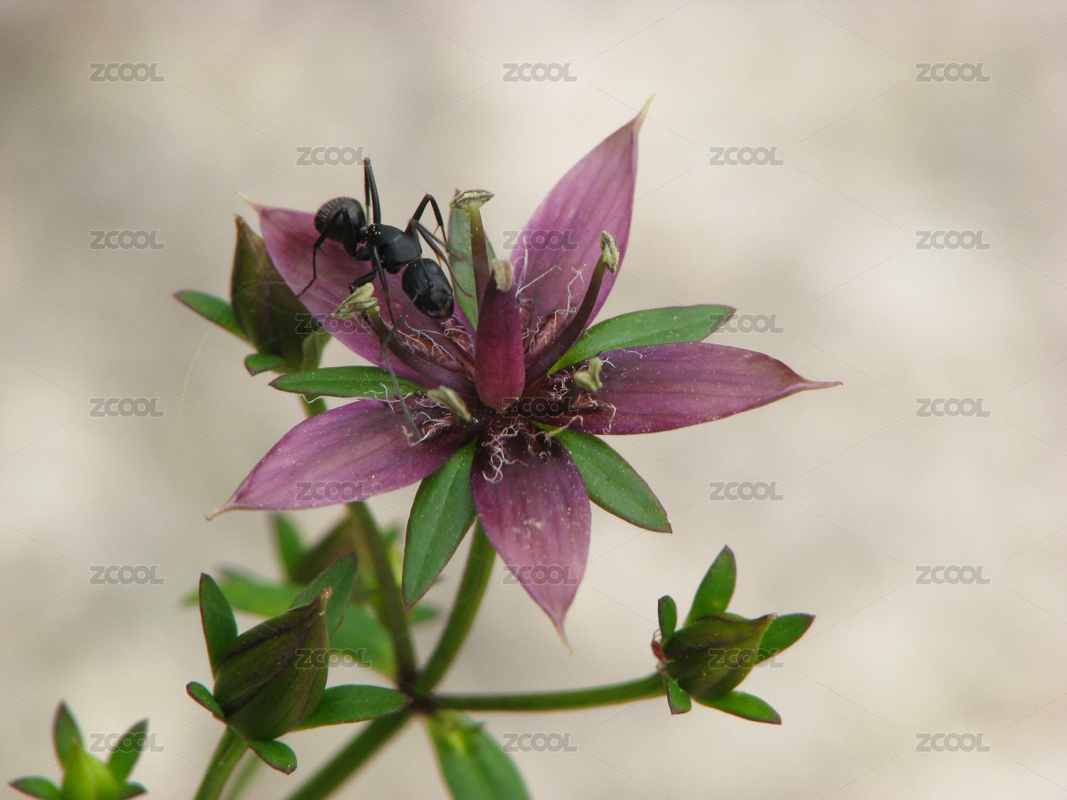 一只黑色的蚂蚁在紫红獐牙菜上面爬行