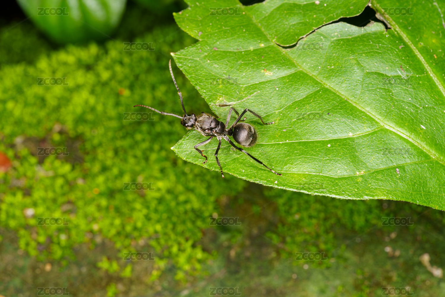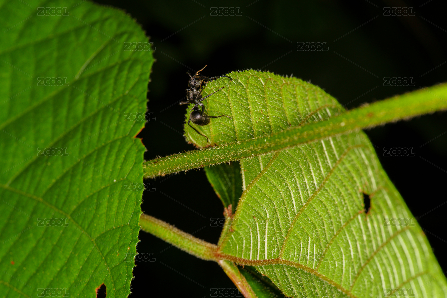 绿叶上的黑色蚂蚁特写