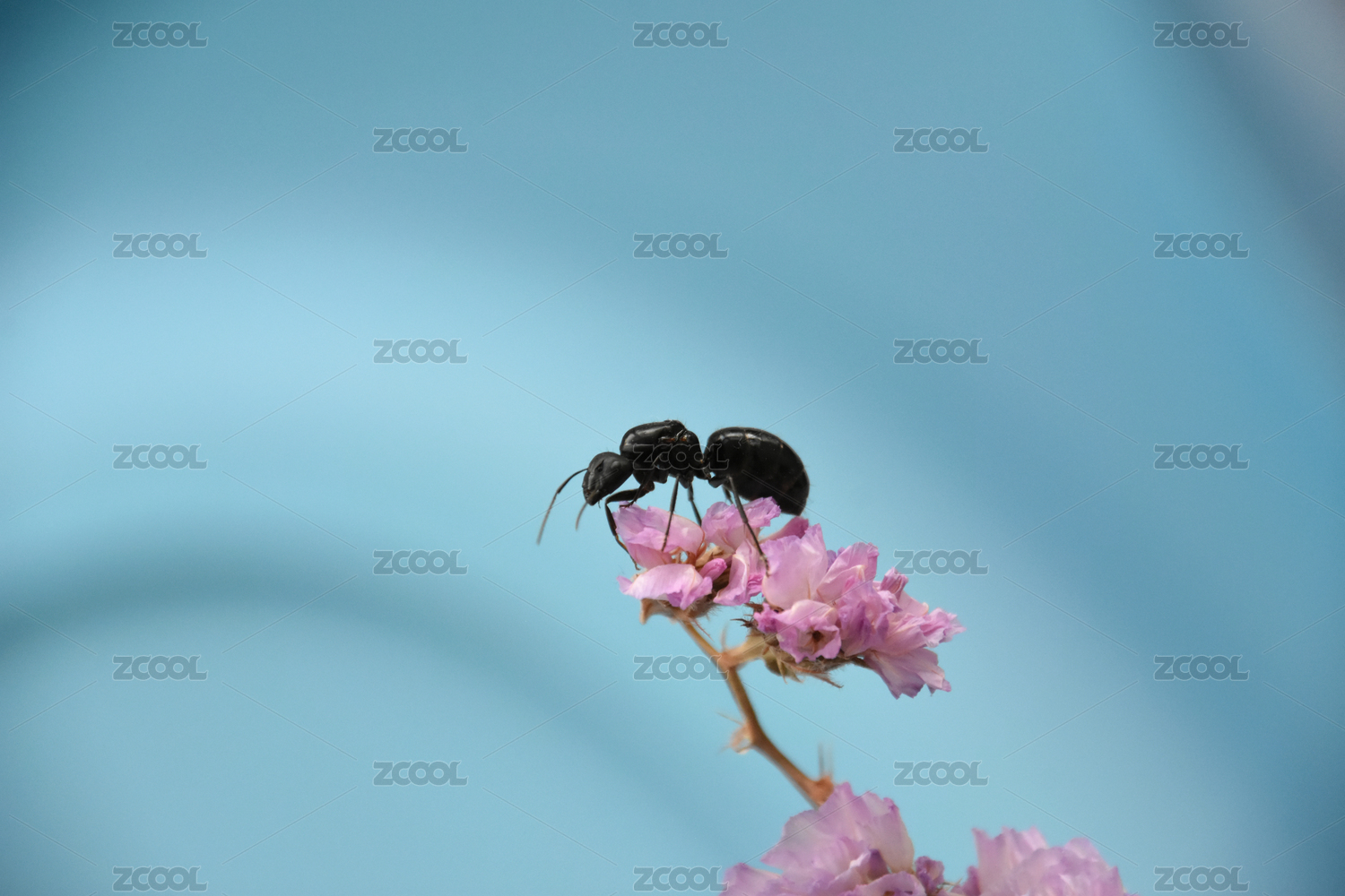 浅蓝色背景上一只爬在紫色花朵上的黑色蚂蚁
