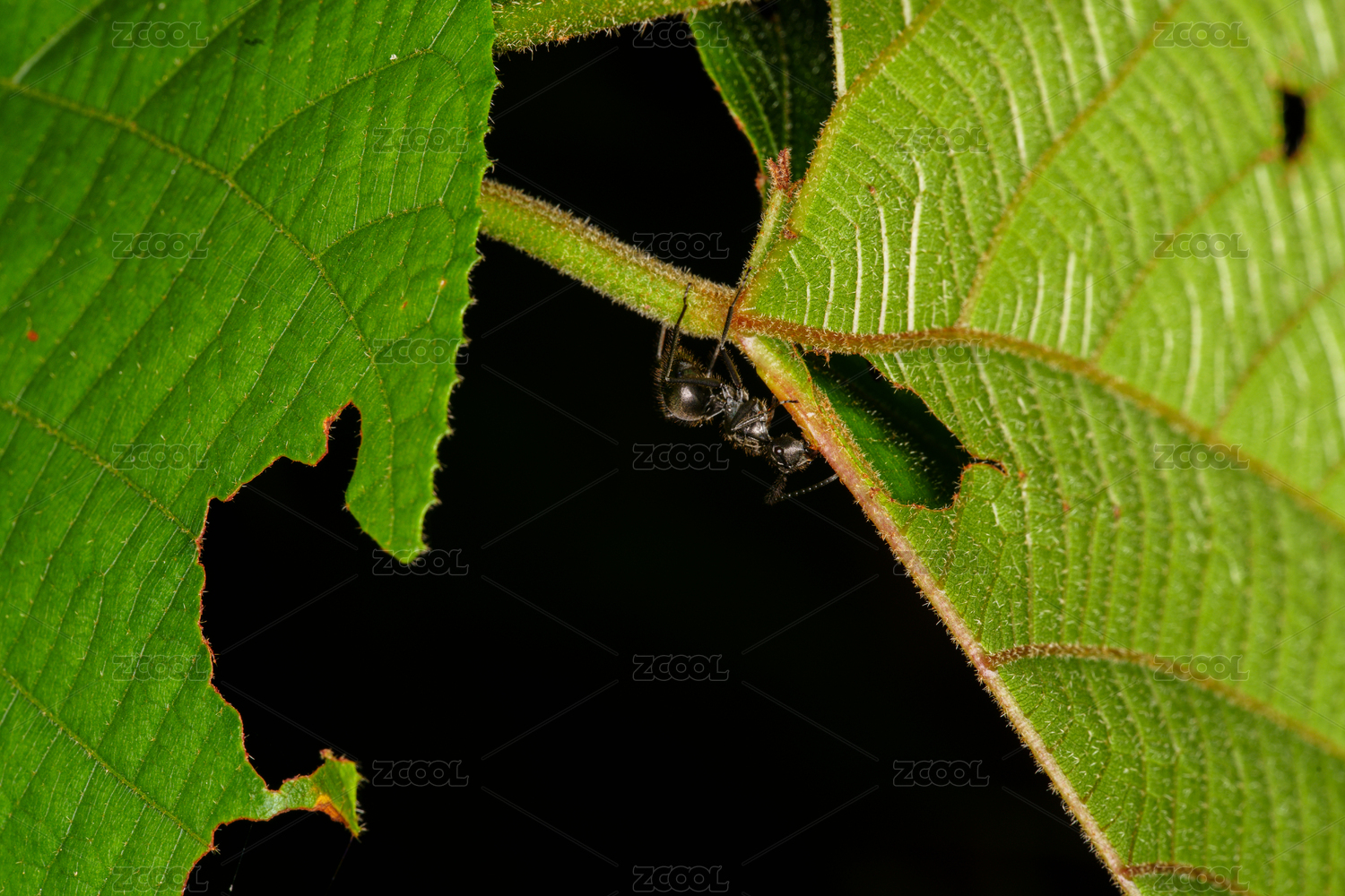 在植物叶子下一只在爬动的黑色蚂蚁