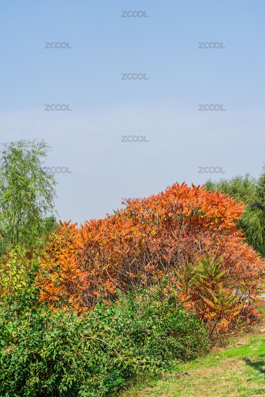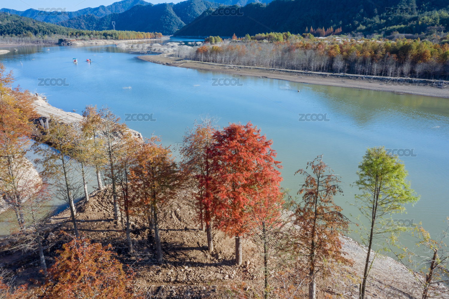 安徽宣城游船行驶在两岸有红色树木的河流中