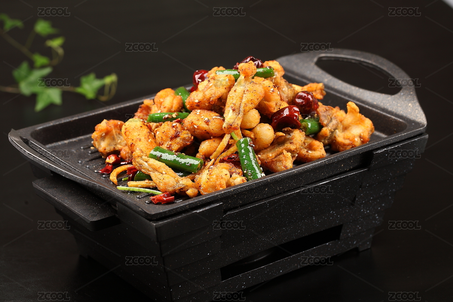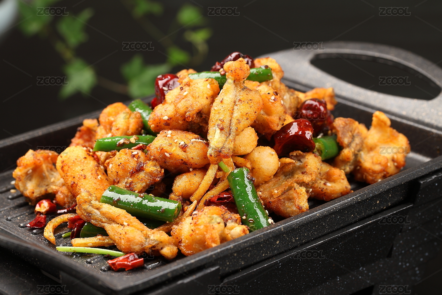 特色川菜辣子鸡盛放在黑色的盘子里