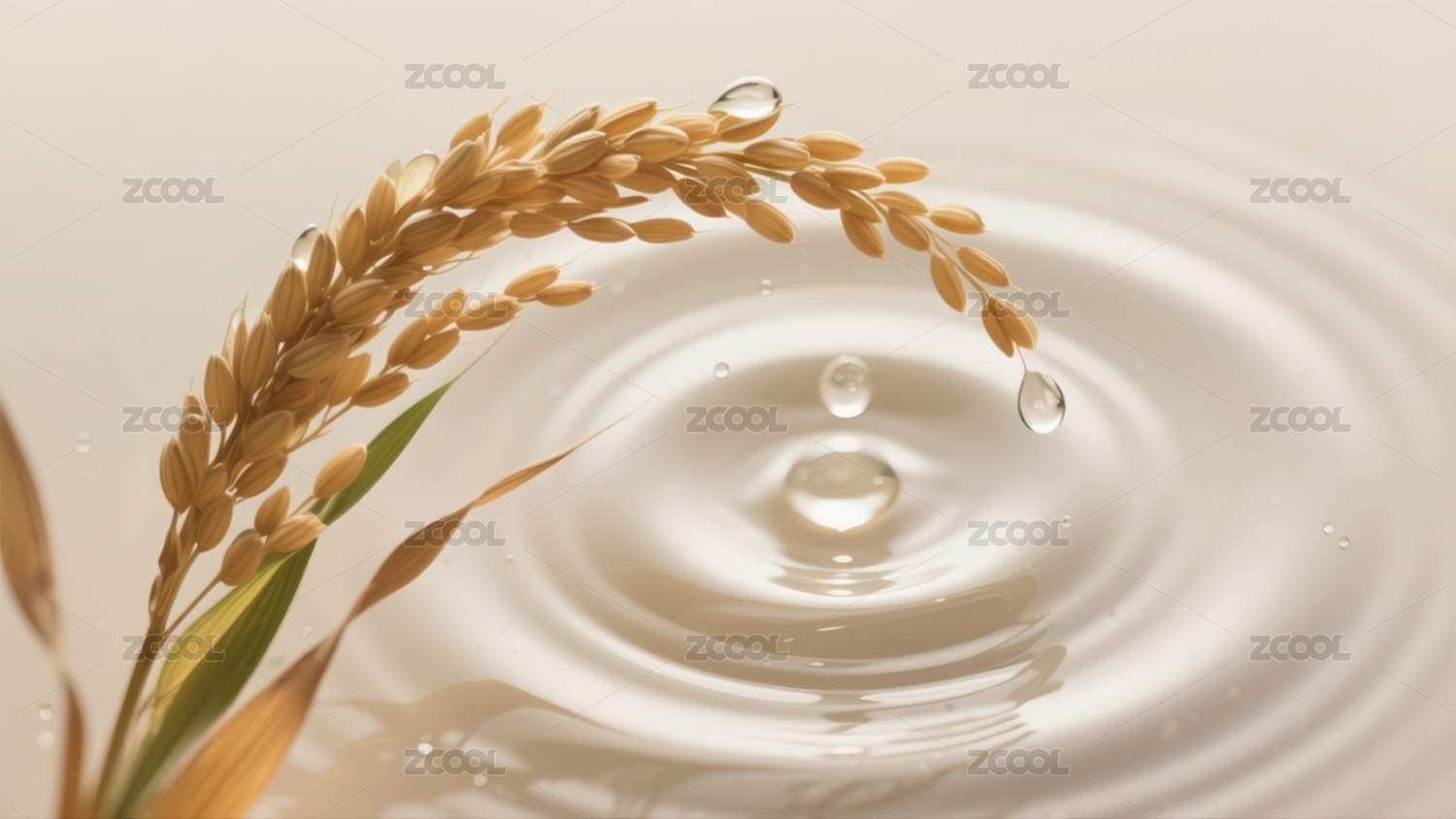 稻穗带水滴入水面起涟漪