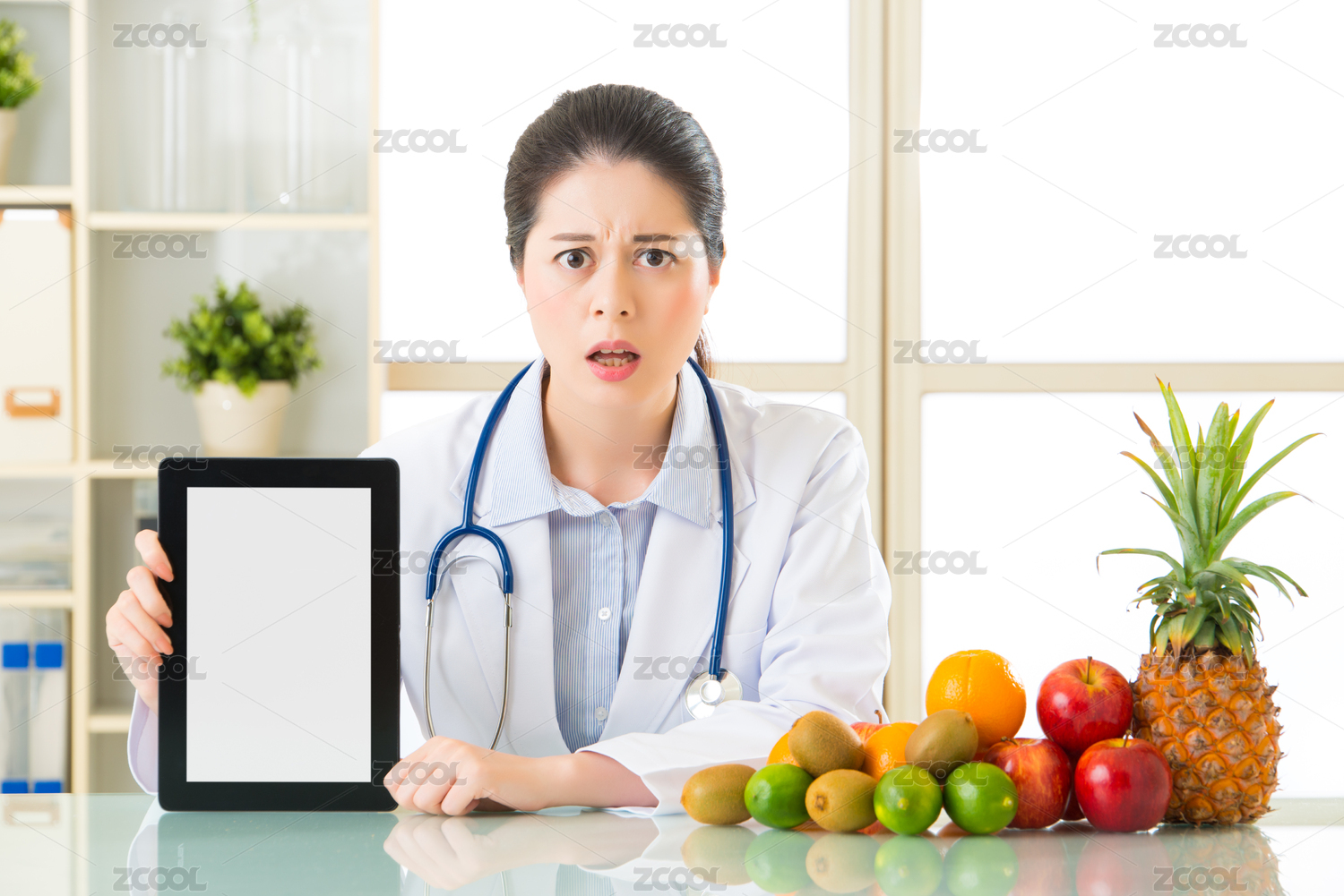 医生营养师水果和持有数字平板下跌的恐惧,检测报告
