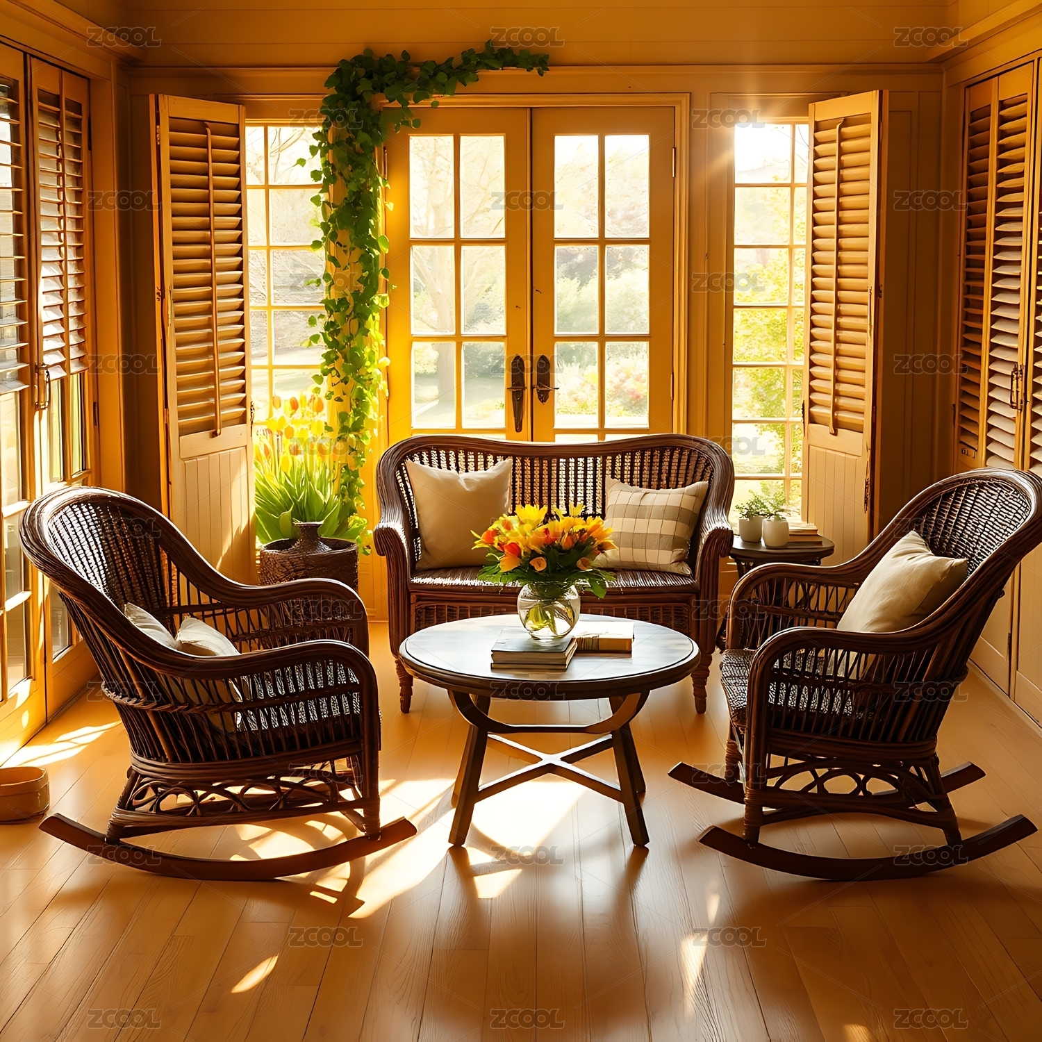温馨田园风格客厅布置有花卉沙发和藤制家具