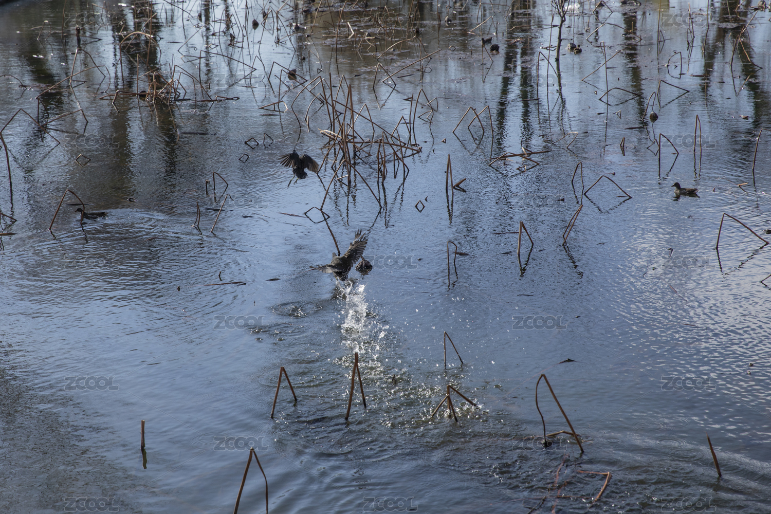 白骨顶在冬季的湖水中浮水显出倒影