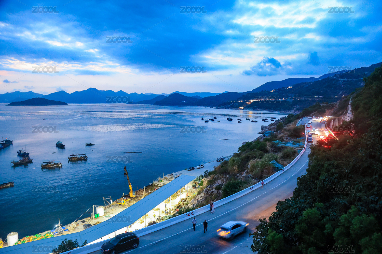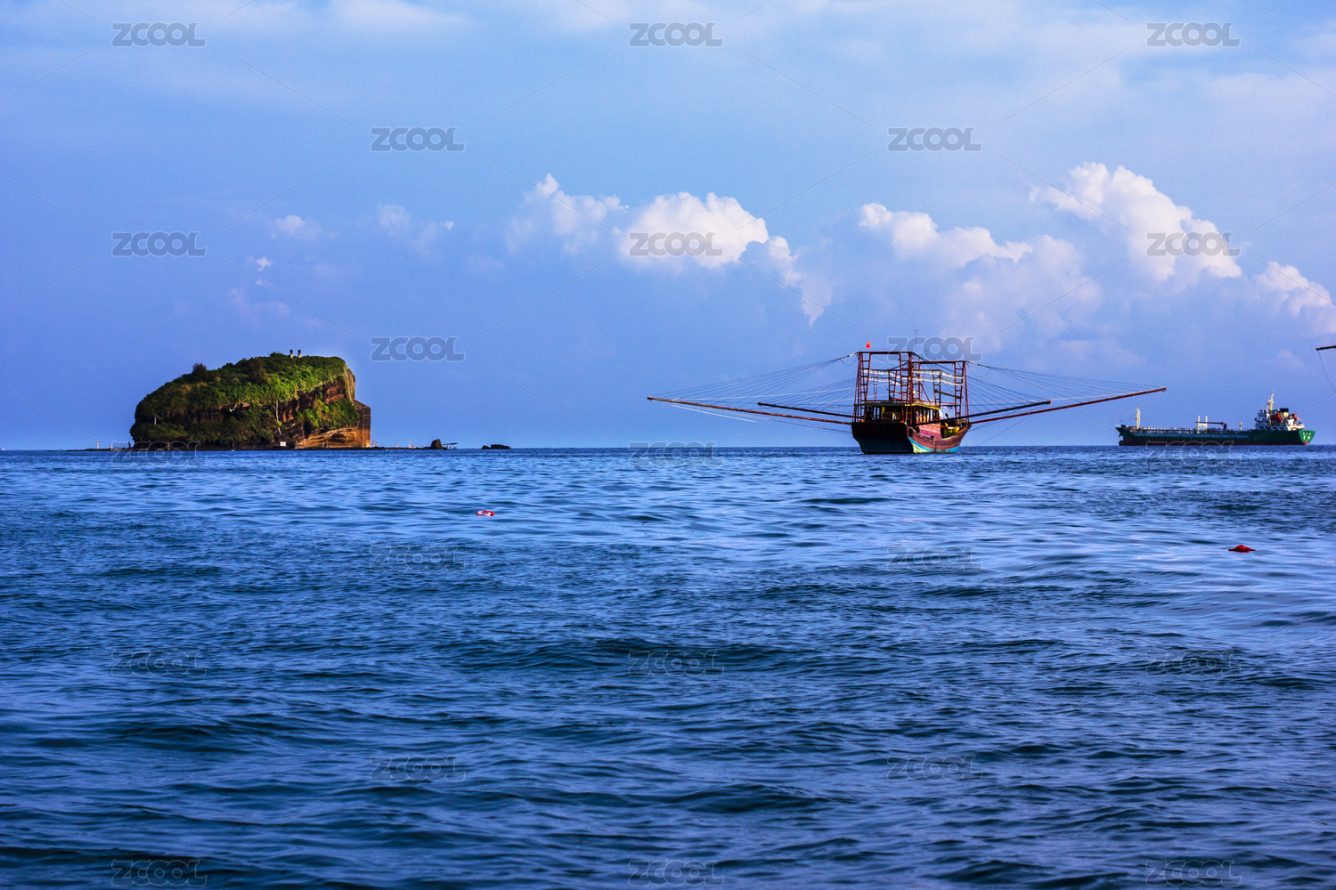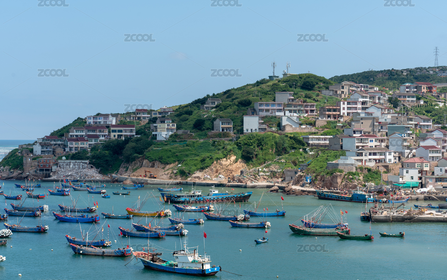 中国舟山枸杞岛岛屿上有房屋海上停泊渔船