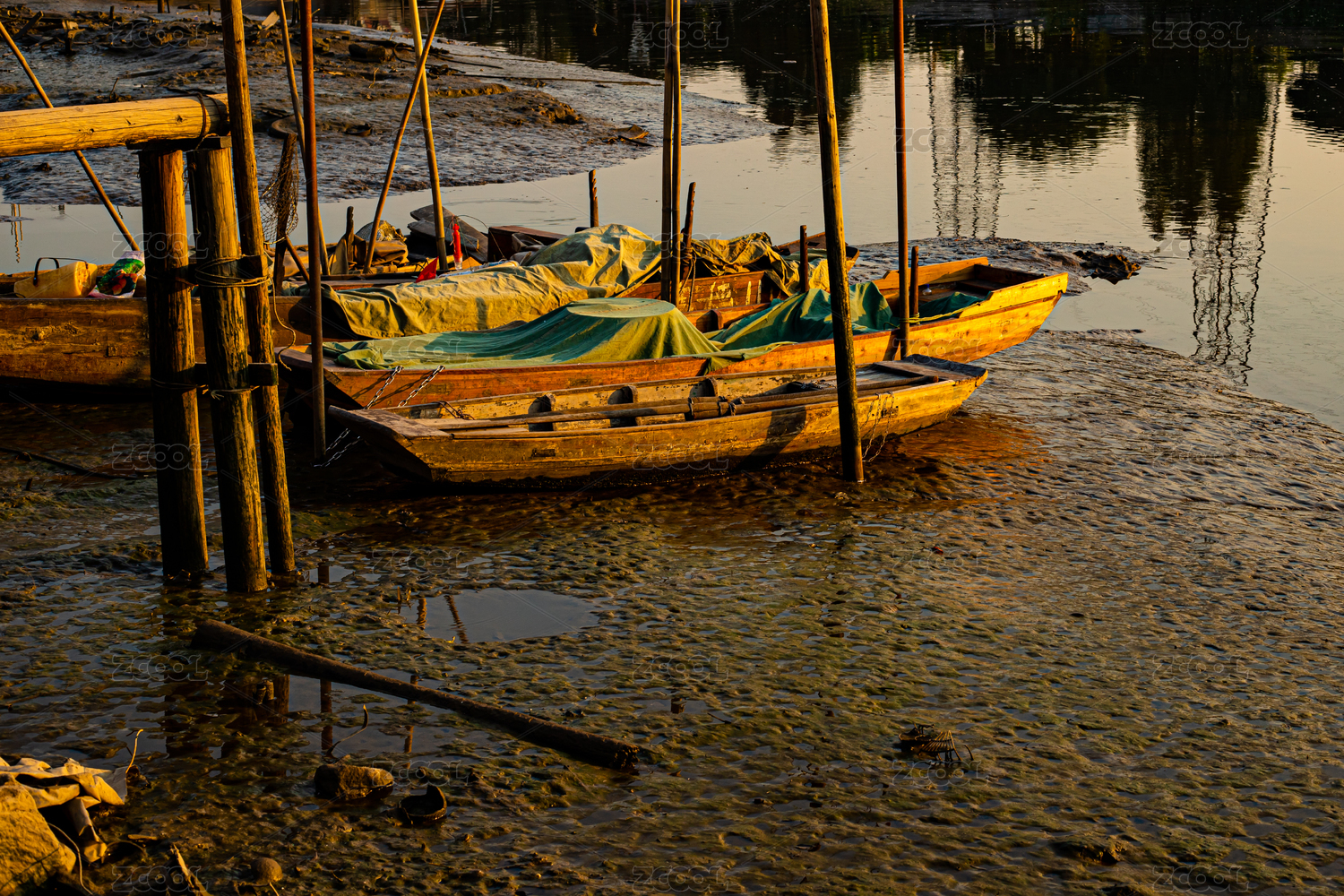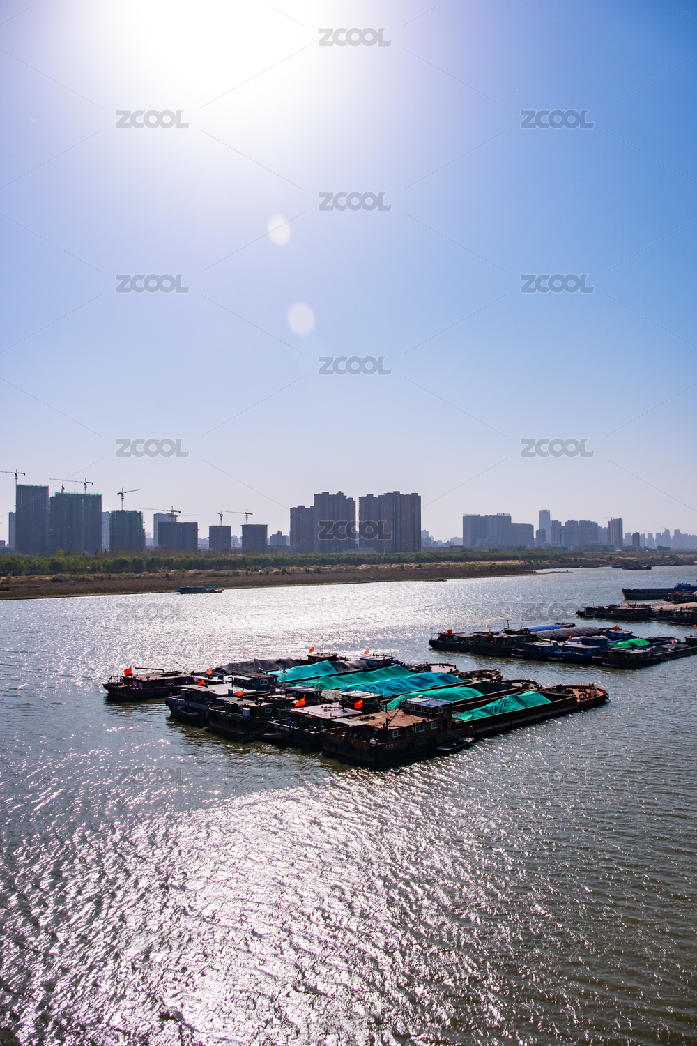 夏日停靠在淮河的中国安徽省蚌埠市多艘渔船
