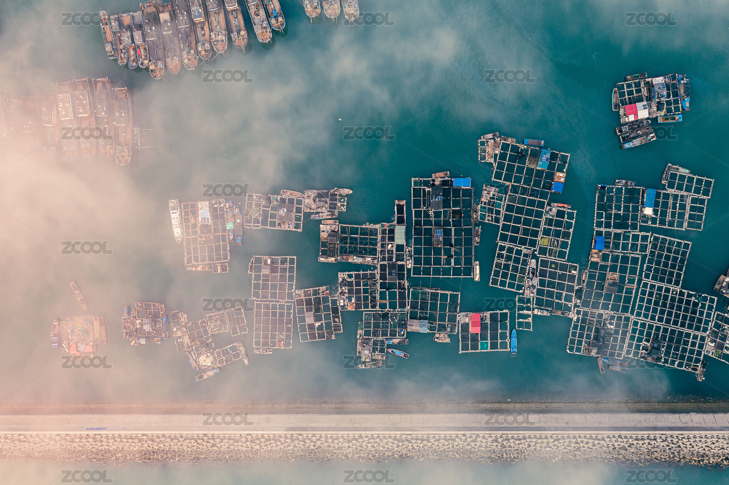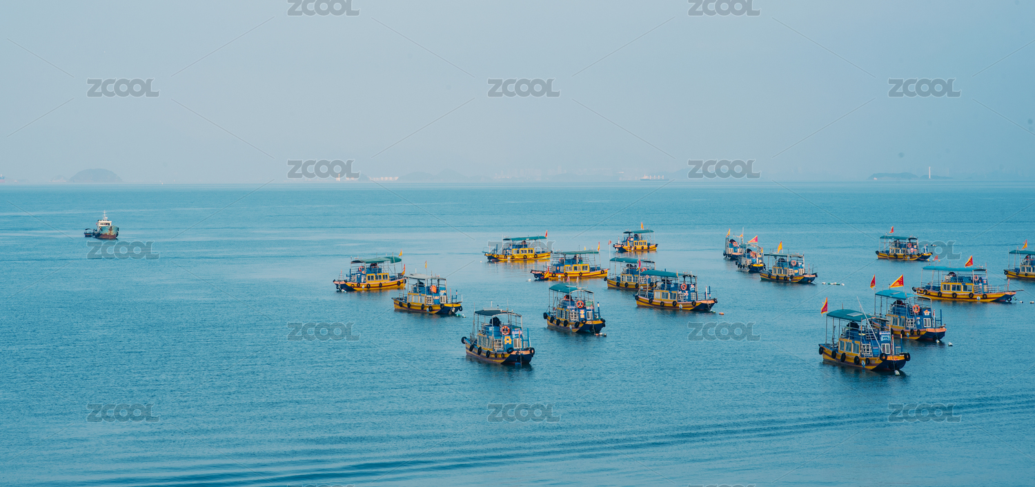 中国舟山枸杞岛蓝色海洋上有排列有序的渔船