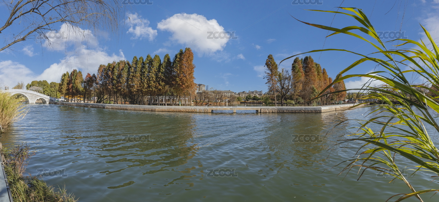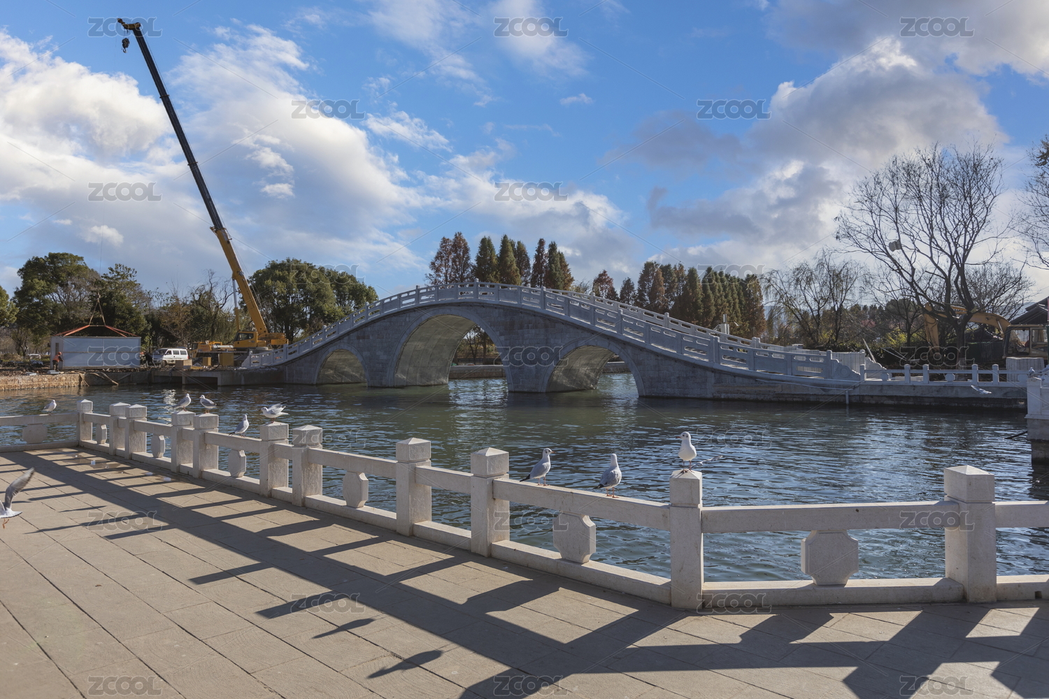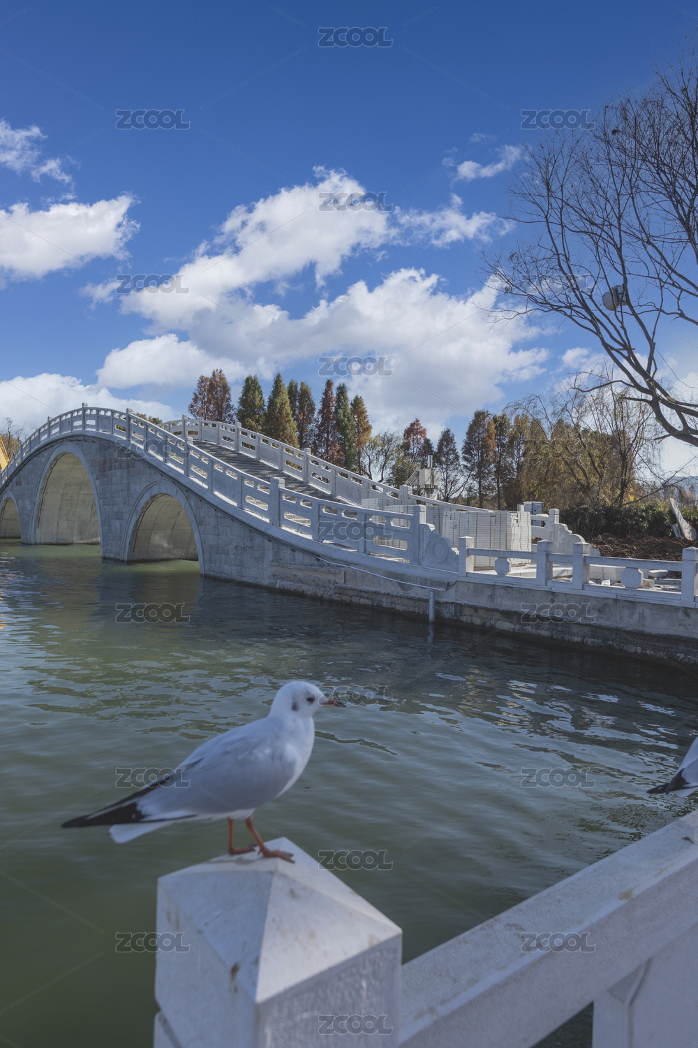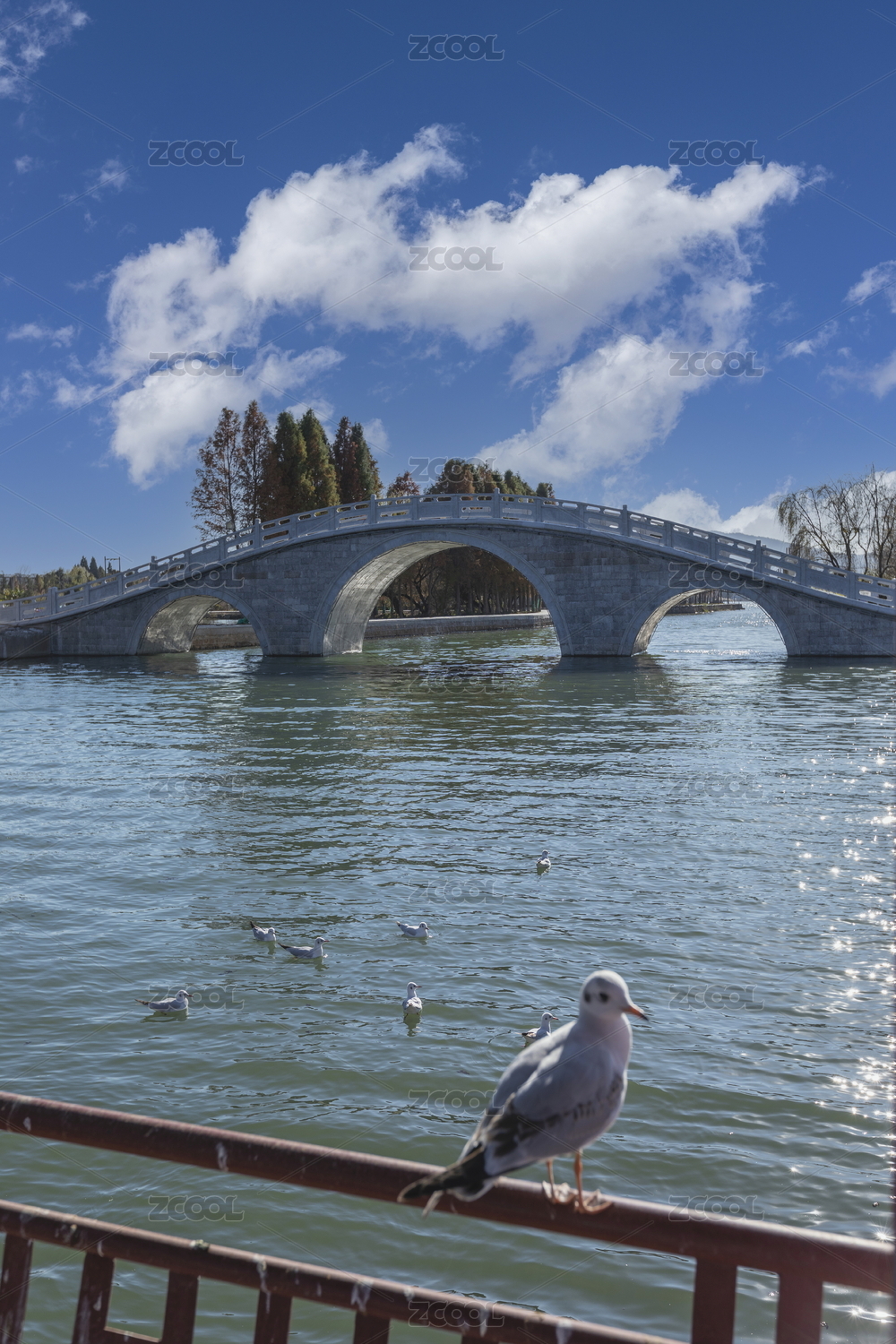 云南昆明大观楼公园蓝天白云石拱桥红嘴鸥