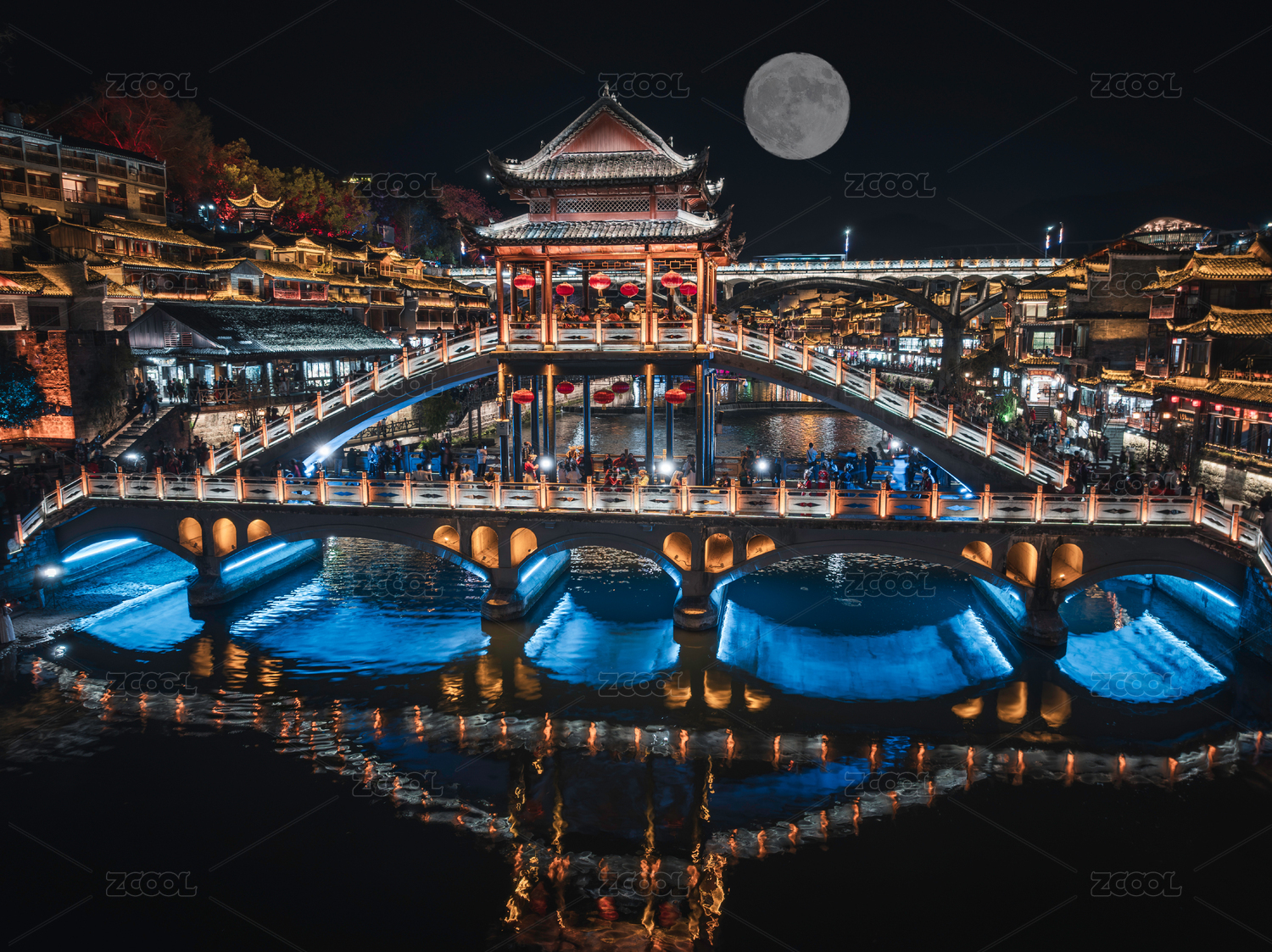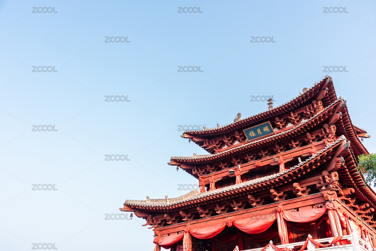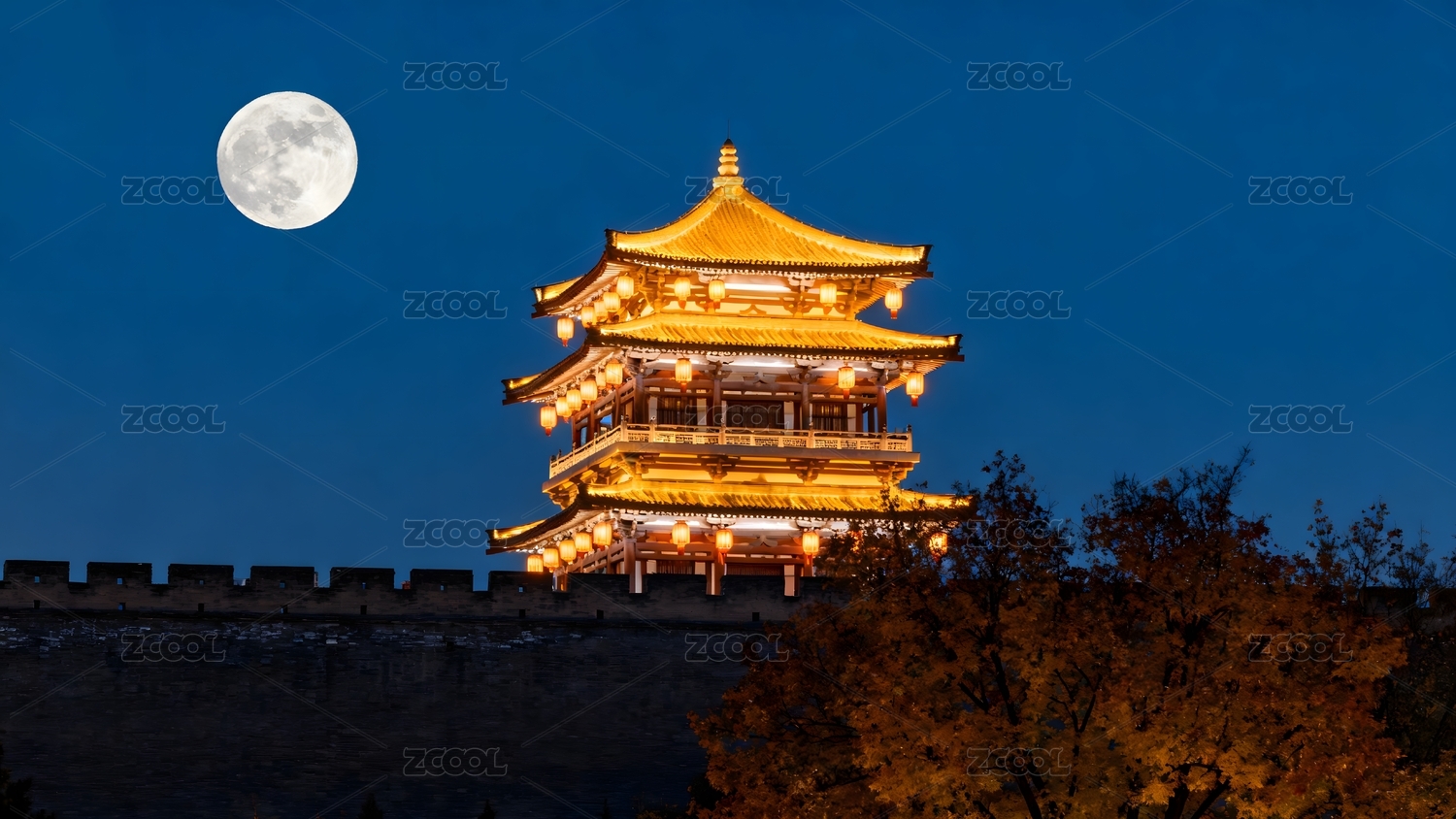中国山西省平遥县夜晚古城墙角楼园林建筑