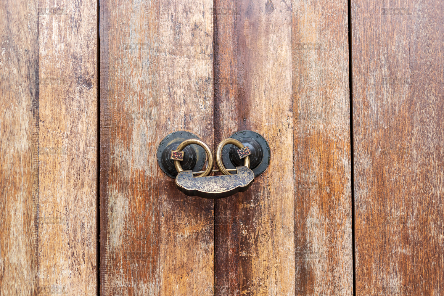 棕色木门上的传统工艺品老式铜锁